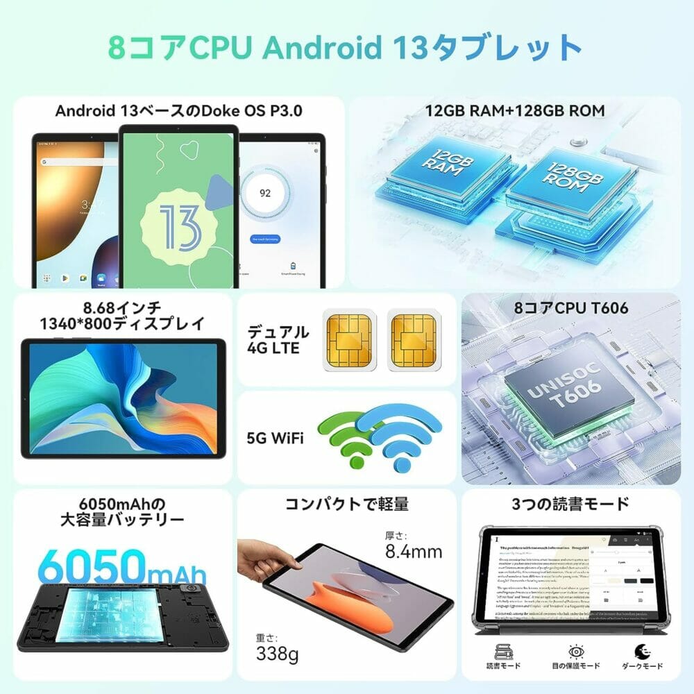 『Blackview Tab60』は、8.68インチの小型な筐体に充実したスペックが詰め込まれたタブレットだ。OSはAndroid13ベースのDokeOS_P3.0を採用。