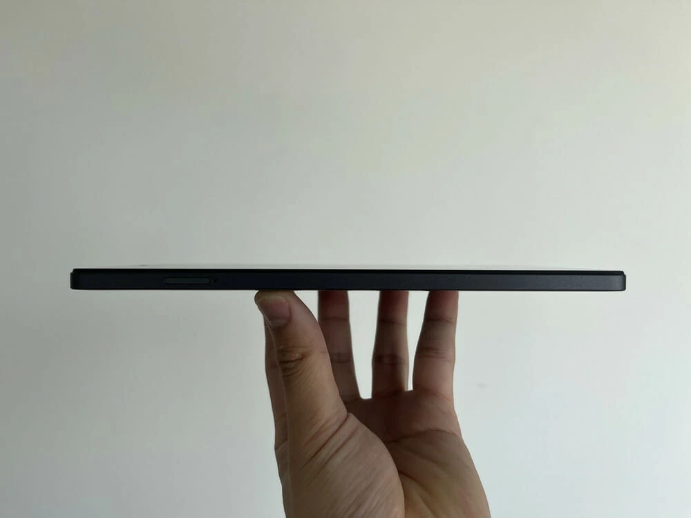筐体サイズは211.7 × 124.4 × 8.4 mm、重量は約338gと小型かつ軽量で、長時間持ち続けても疲れず、カバンなどに入れて外出先へ持ち運ぶ用途にも適している。