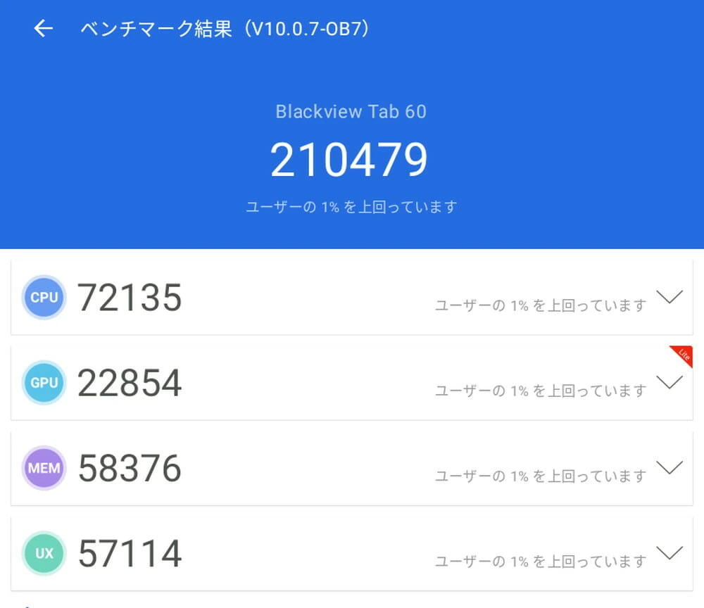 1万円台の価格帯の小型タブレットとしては、優れたスコア結果であると言える。