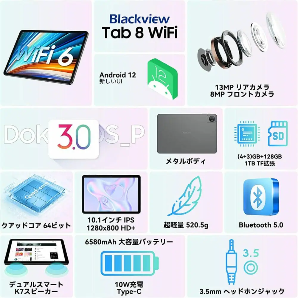 「Blackview Tab8 WiFiモデル」は、Android12ベースのDOKE OS_P 3.0を搭載したタブレットだ。