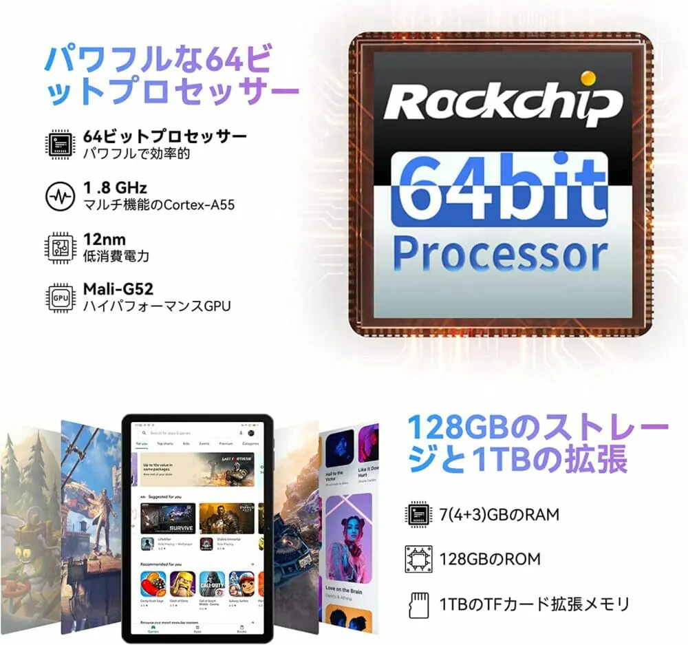 CPU(SoC)にはRK3566(Cortex-A55)を、RAMは4GBを採用。一般的なタブレット用途は問題なくスムーズにこなせるだけの性能を擁している。RAMは最大7GBまでの拡張が可能で、よりスムーズなタブレット操作を楽しめるようになるだろう。