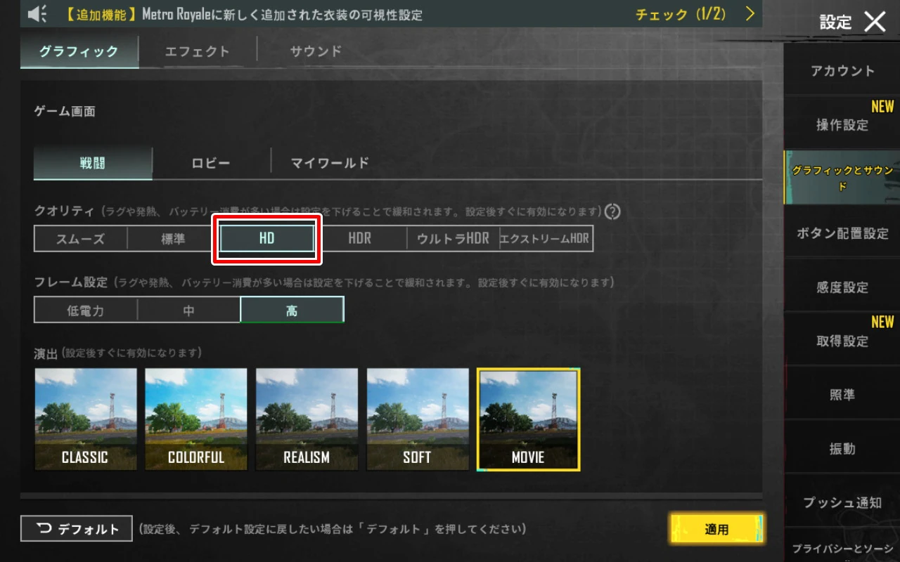 まずグラフィッククオリティに関しては『HD』まで選択できた。