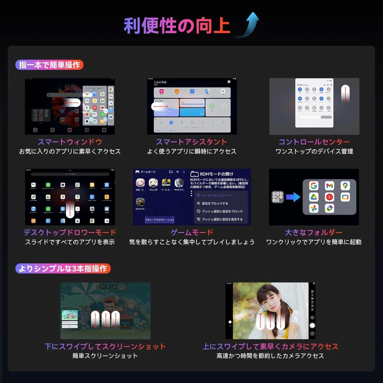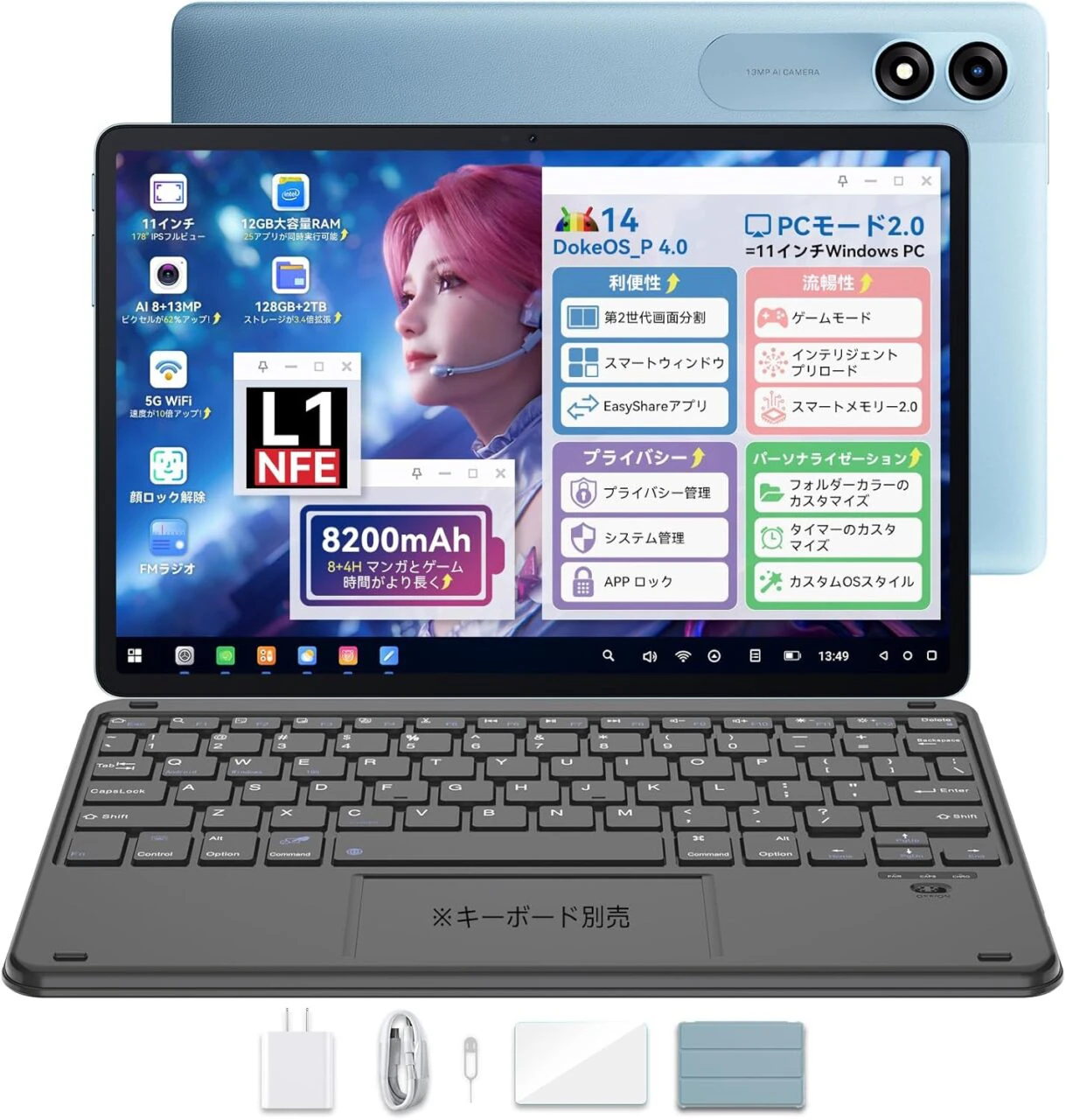 Android 14ベースの独自OS「DokeOS_P 4.0」を搭載。スムーズかつ直感的な操作を楽しる。また、PCモード2.0に対応しており、マルチウィンドウで複数タスクを同時実行するなど、タブレットPCのような利用方法が可能となっている。