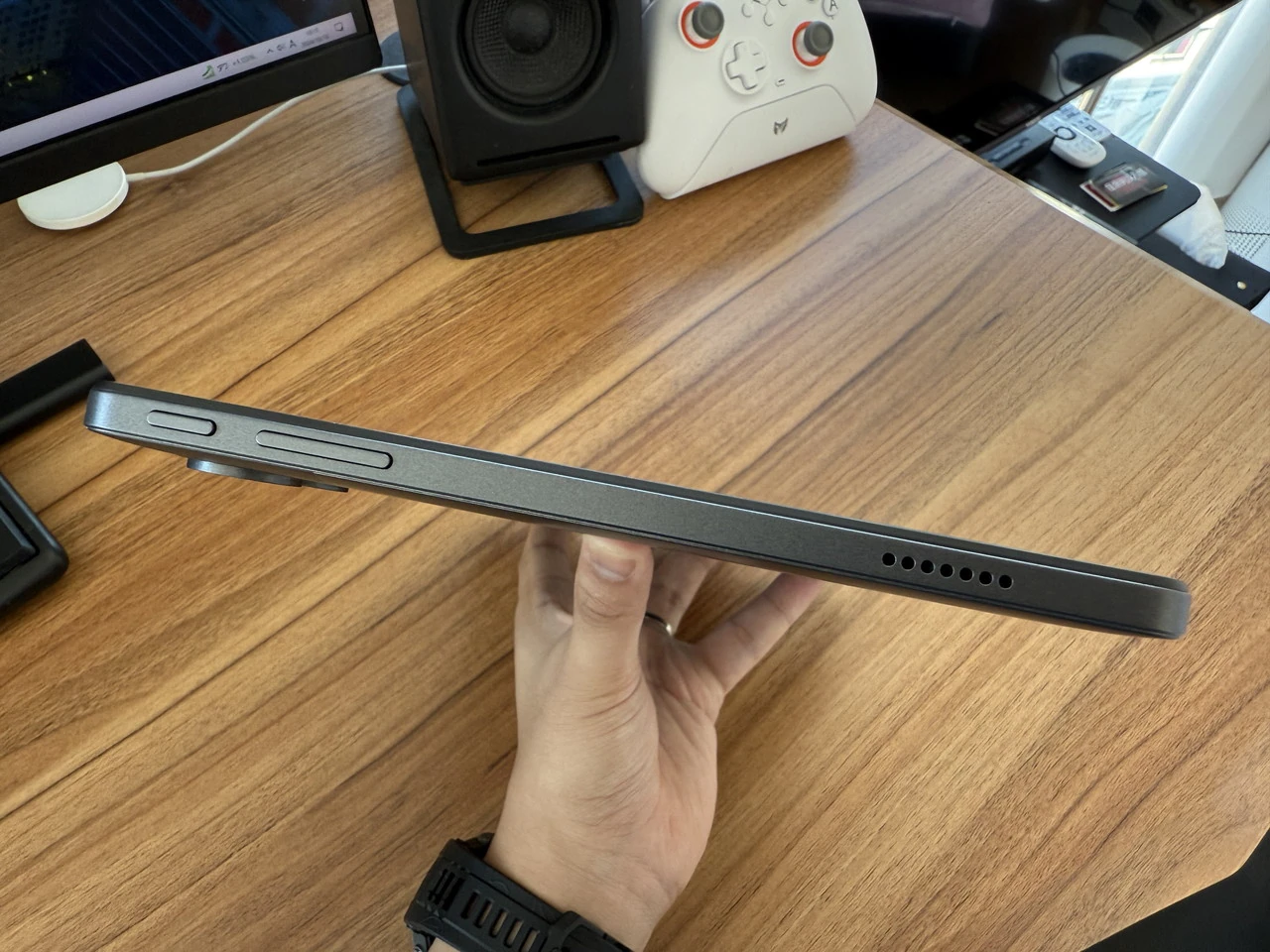 ▼上部の様子。電源ボタン、音量調節ボタンに加えて、スピーカーを内蔵。