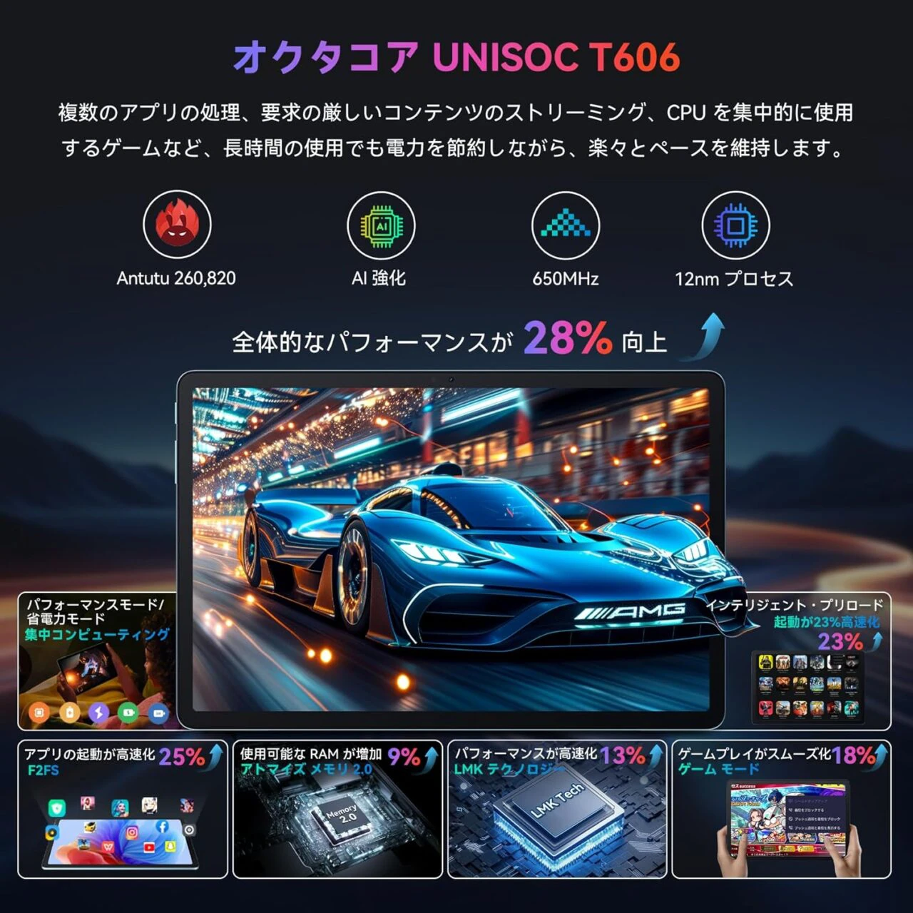 CPU(SoC)にはUnisoc T606 オクタコアプロセッサーを、RAMは4GB DDR4Xを採用。一般的なタブレット用途は問題なくスムーズにこなせるだけの性能を擁している。なお、最大8GBの仮想RAM拡張が可能で、よりスムーズなタブレット操作を楽しめるようになる。