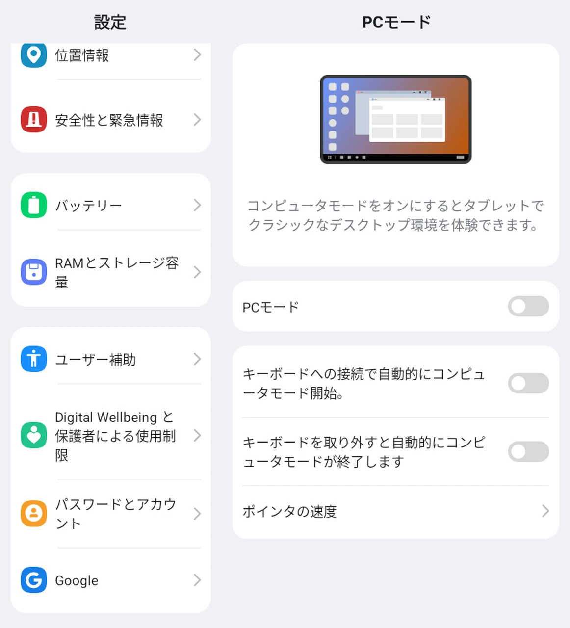 本製品はPCモードに対応しており、Windowsのようなインターフェース配置でタブレットを利用できる。