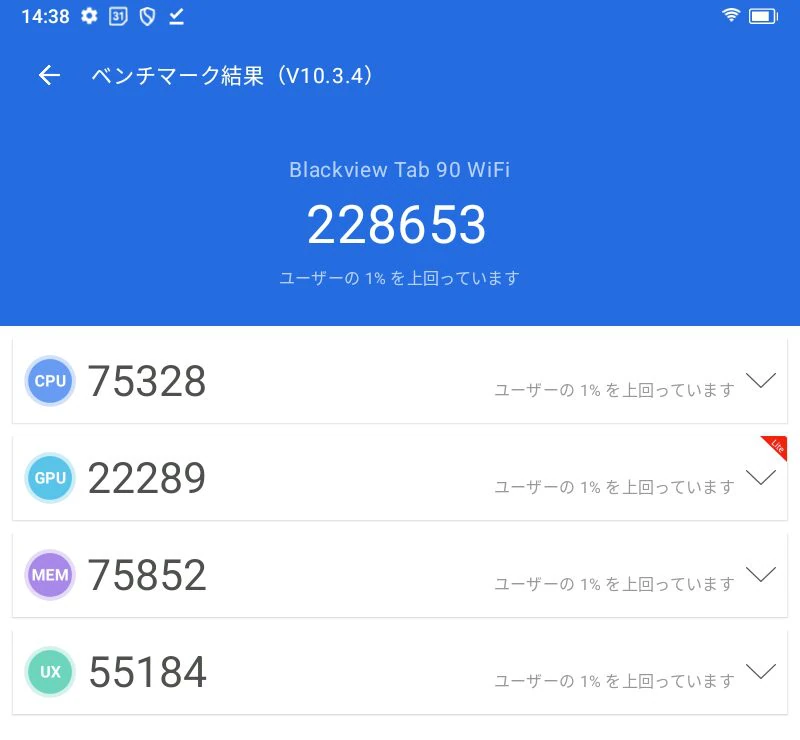 本機について、スマホ・タブレット端末の性能を測ることのできる『AnTuTuベンチマークテスト』を実施してみた。