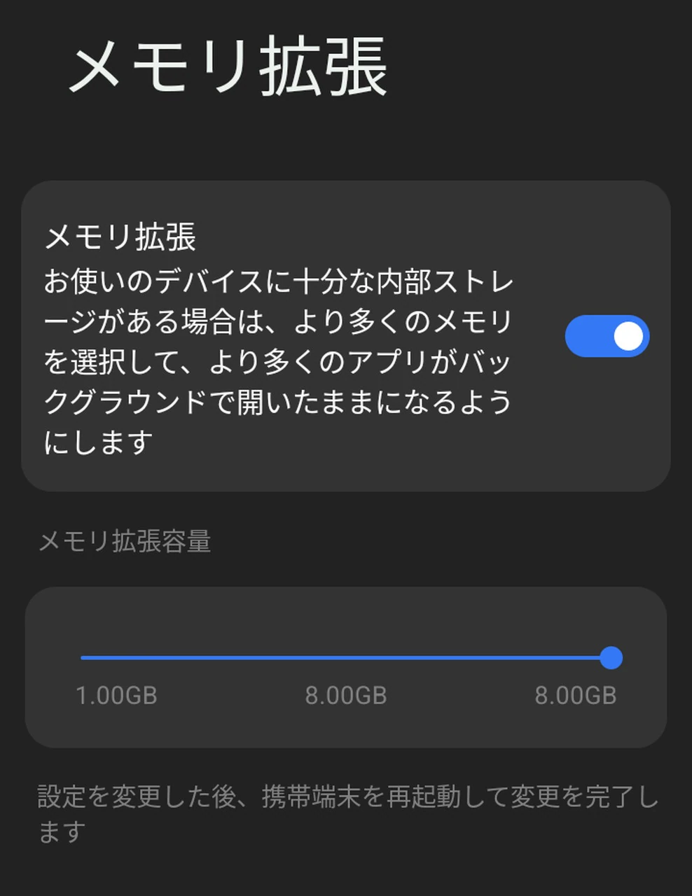 設定アプリから最大8GBの仮想メモリ(RAM)拡張を行うこともできる。
