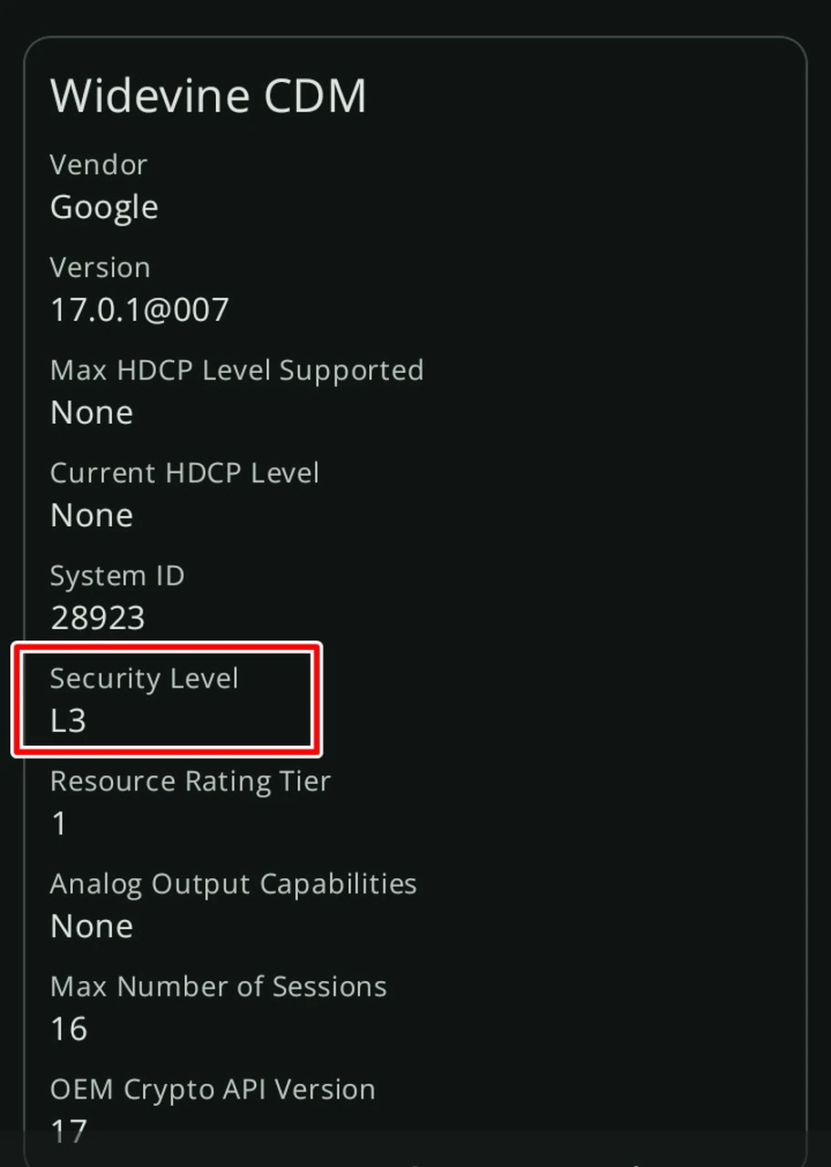WidevineはL3サポートとなっている。本製品のディスプレイ解像度は1612×720のため、L1サポートは不要か。