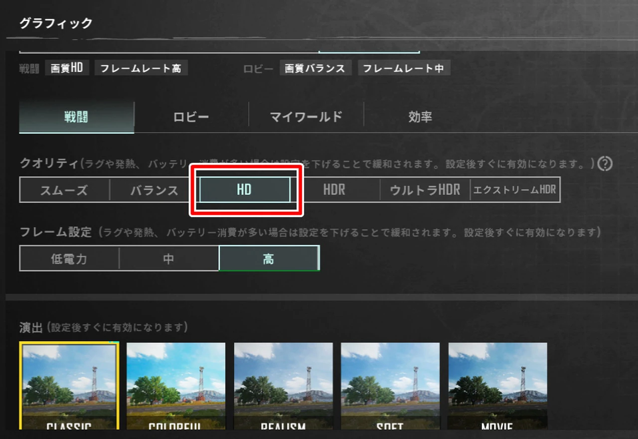 まずグラフィッククオリティに関しては『HD』まで選択できた。