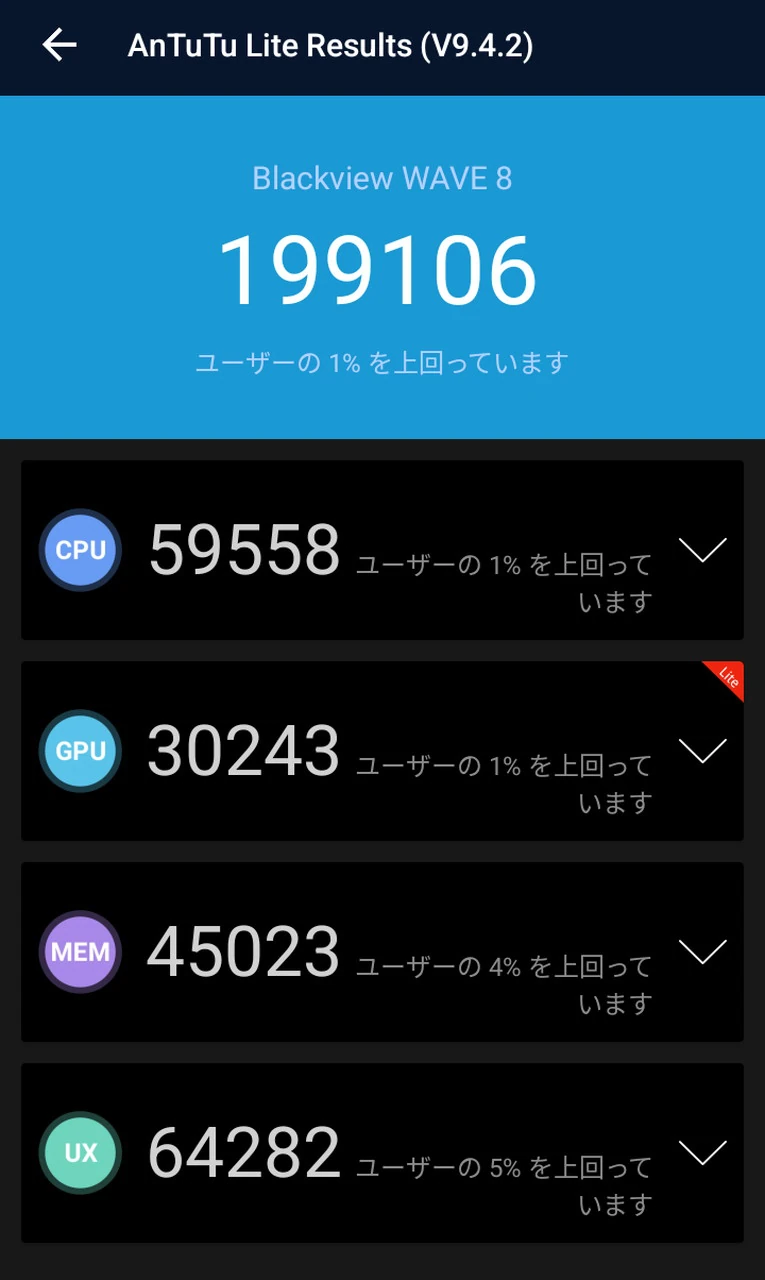 ▼通常のAnTuTuはなぜか途中で強制終了してしまうため、今回のレビュー時にはAnTuTu Lite(v9.4.2)を使用した。