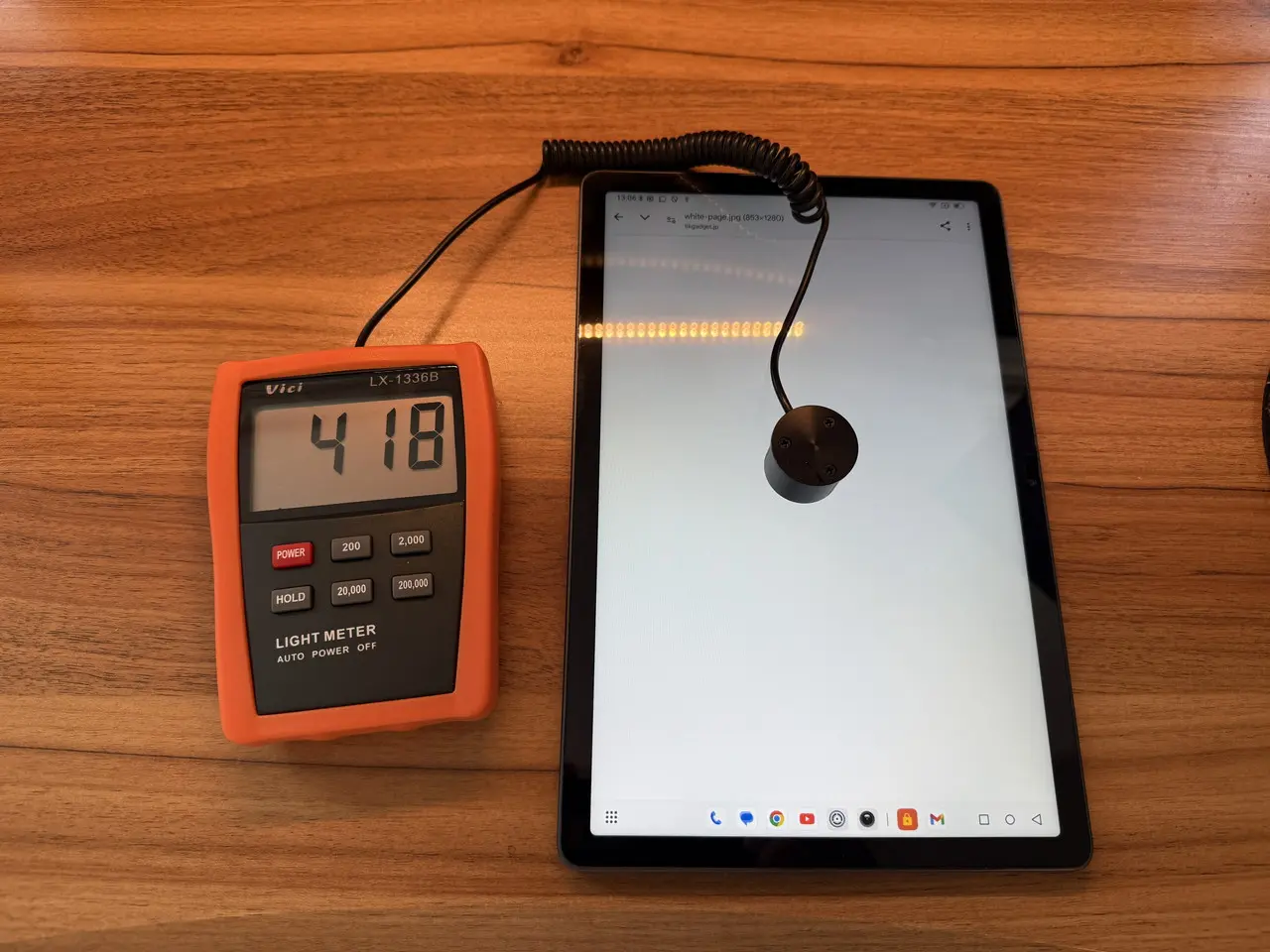 デジタルルクスメーター「Vici LX1336B」を使用して画面の明るさを計測したところ、最高418nitの明るさを得ました。