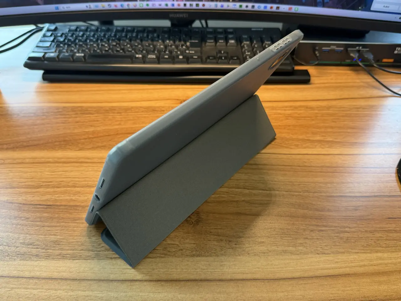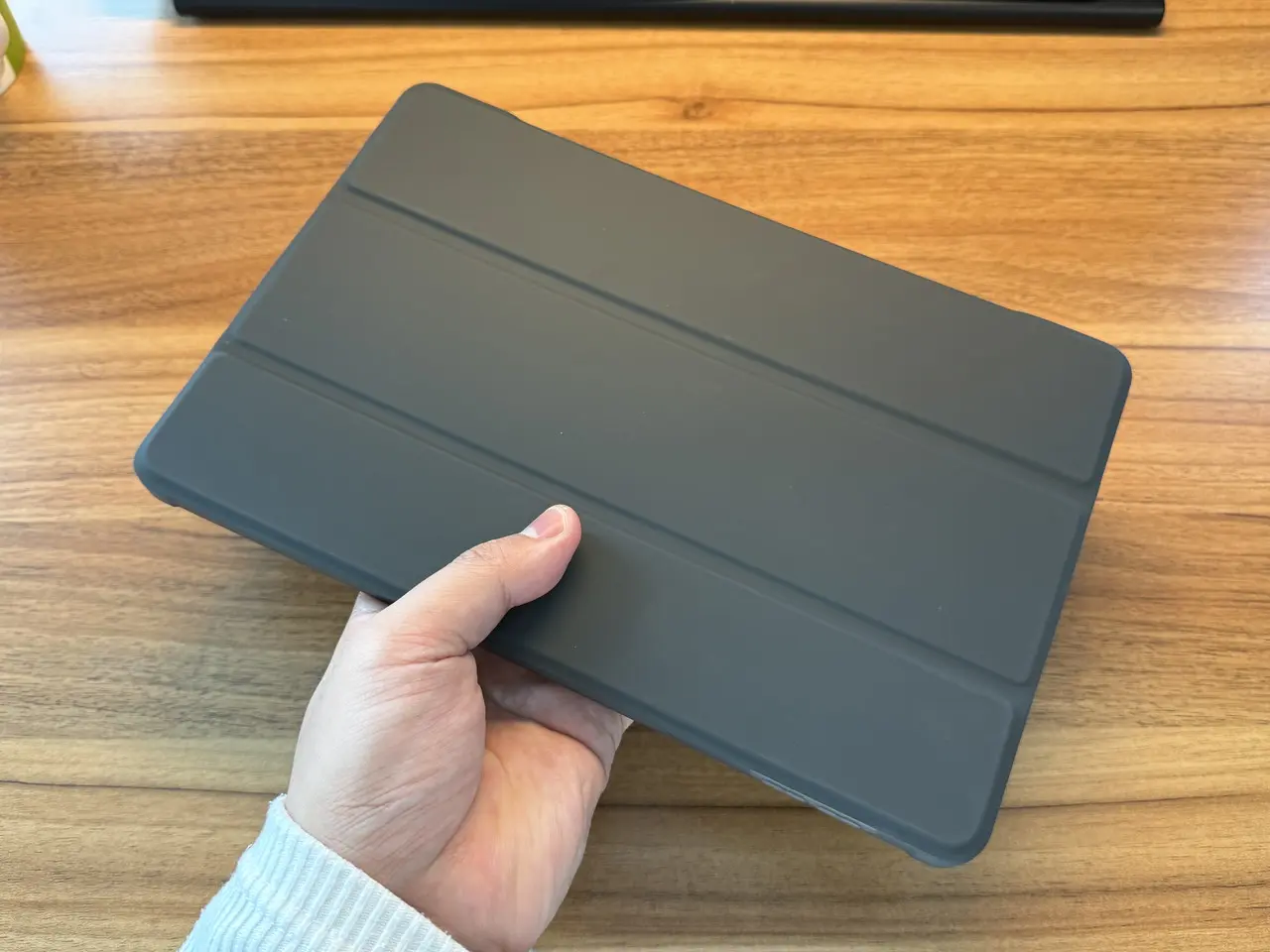 ケースはディスプレイを保護できるため、タブレットの持ち運び時に便利。背面を折りたたむことで、簡易スタンドとしても機能します。