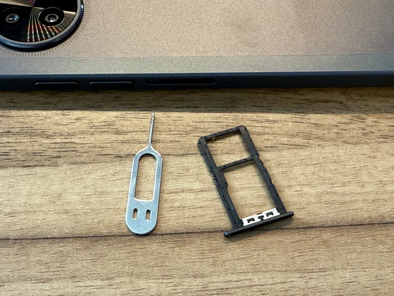 付属のピンでスロットを開き、デュアルnanoSIMカードおよび最大2TBまでのmicroSDカードを挿入できます。
