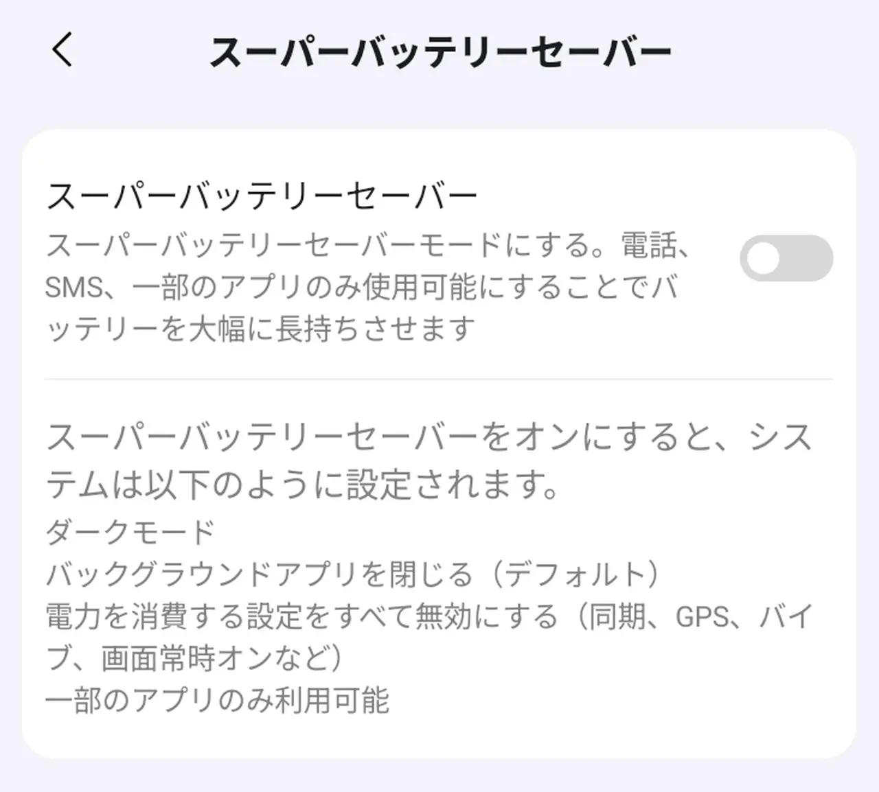 設定から「バッテリーセーバー」をオンにすれば、より長時間の利用も可能に。ここぞという時に使うスマホとして運用したい場合には、常時オンにしておいても良いでしょう。
