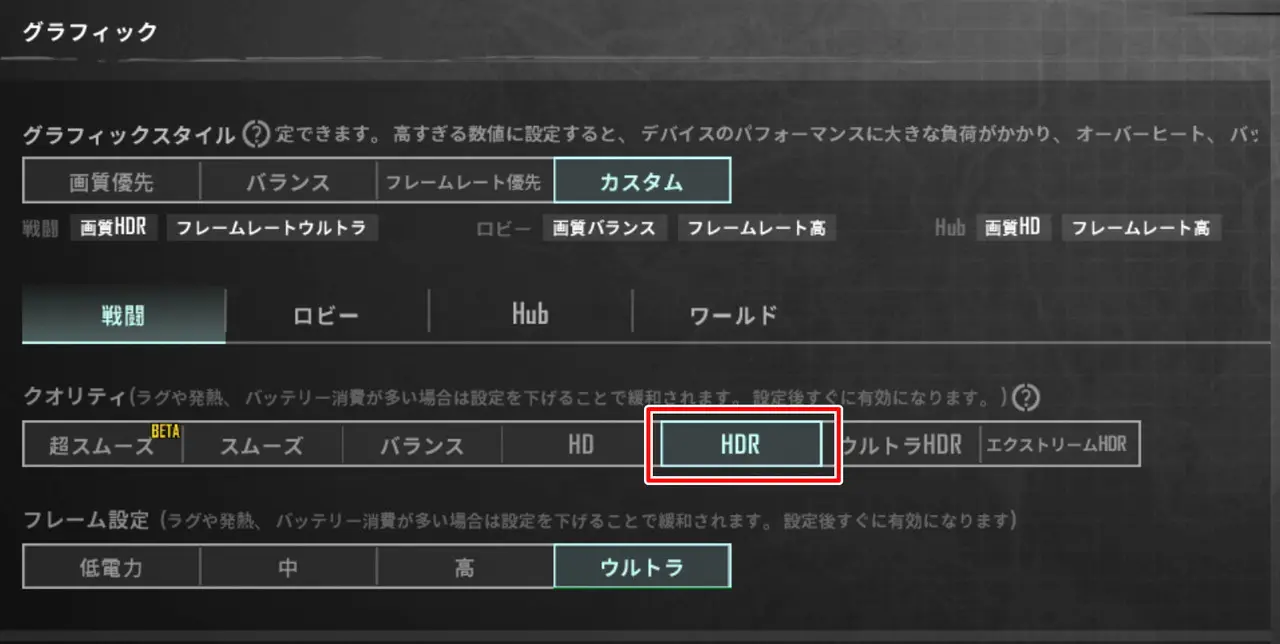 グラフィッククオリティに関しては『HDR』まで選択できました。