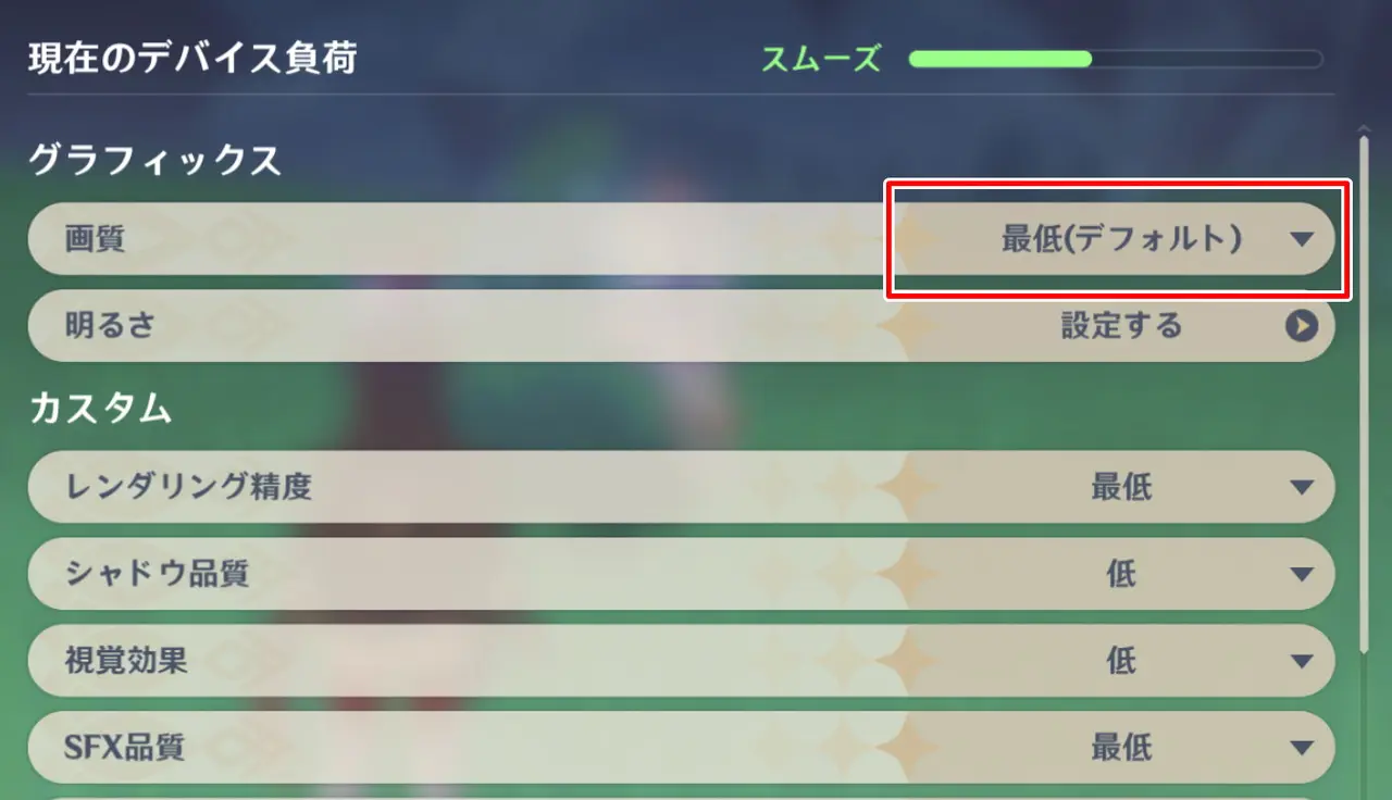 画質設定はデフォルト状態で "最低" に設定されており、デバイス負荷は "スムーズ" の状態。