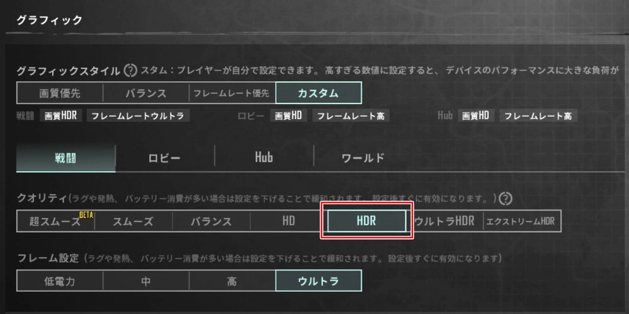 『PUBG』について、グラフィッククオリティは『HDR』まで選択できました。