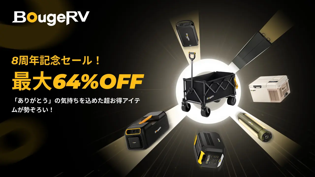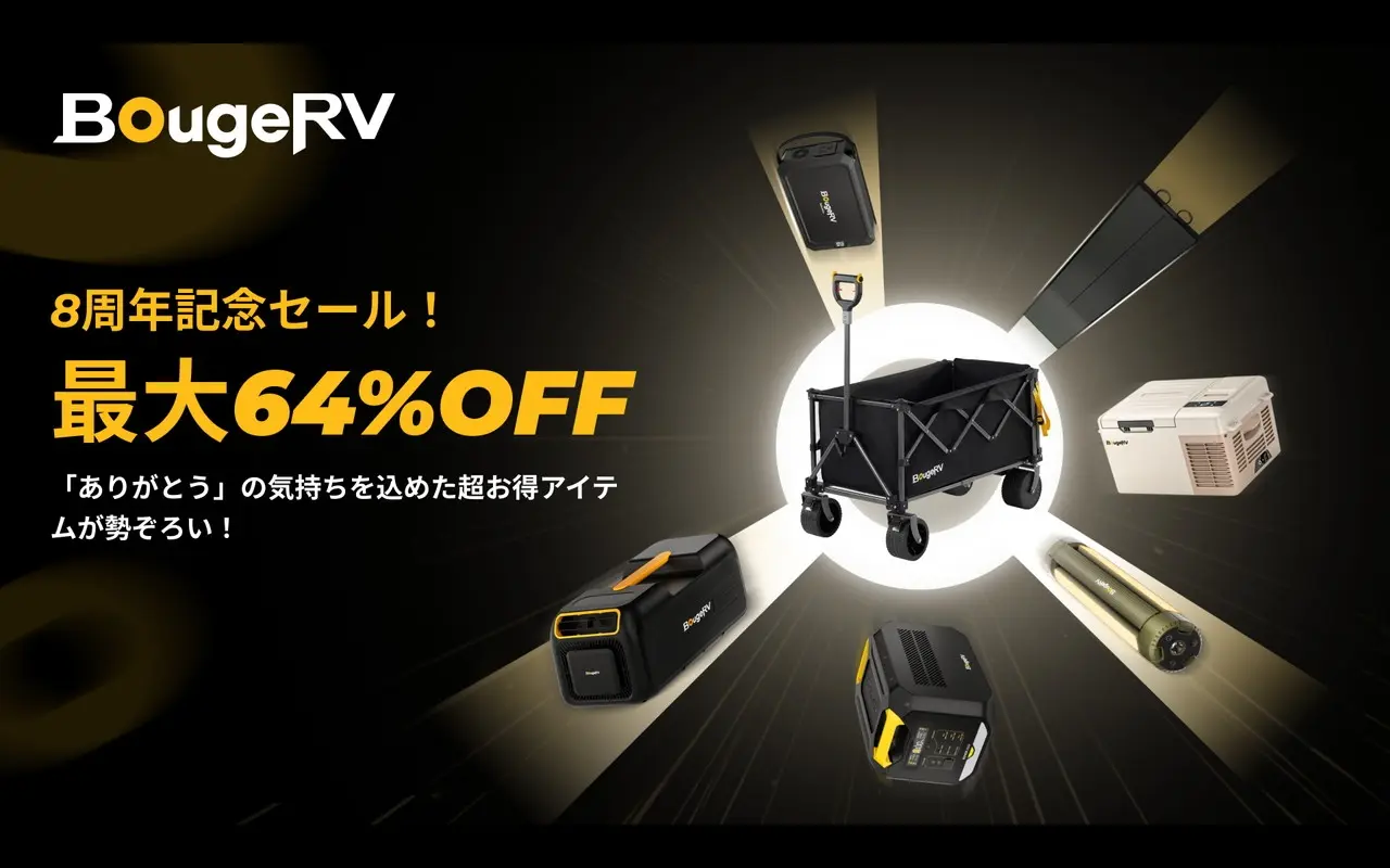 そこで、2025年6月5日(木) ~ 6月30日(月)までの期間中、BougeRVの人気製品を最大64%OFFの大幅割引価格で購入できる『BougeRV創立8周年記念セール』が開催されます。