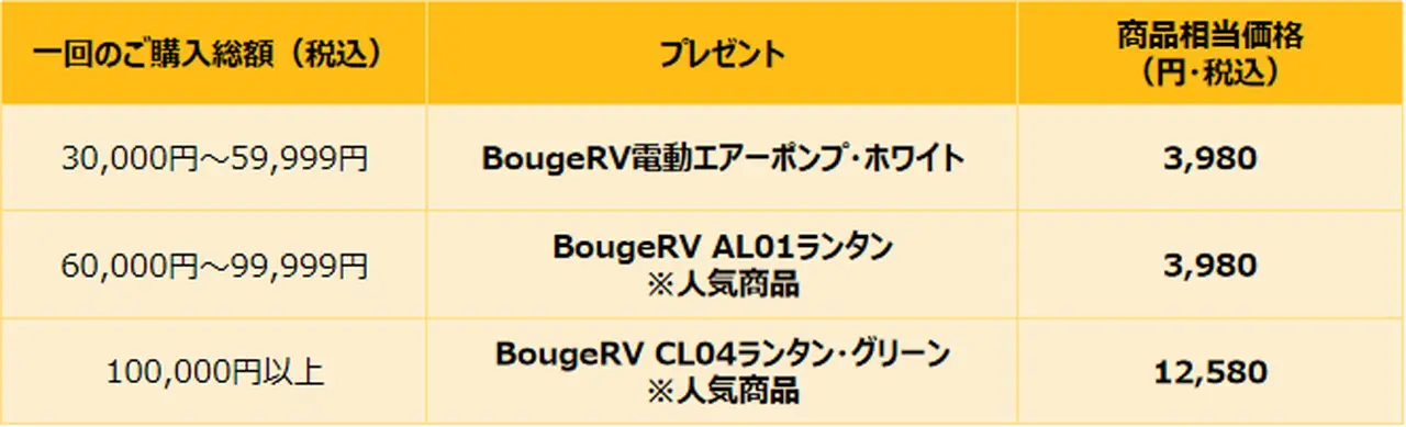 また、1回の購入総額に応じてBougeRV製品がプレゼントされる特典も用意されています。