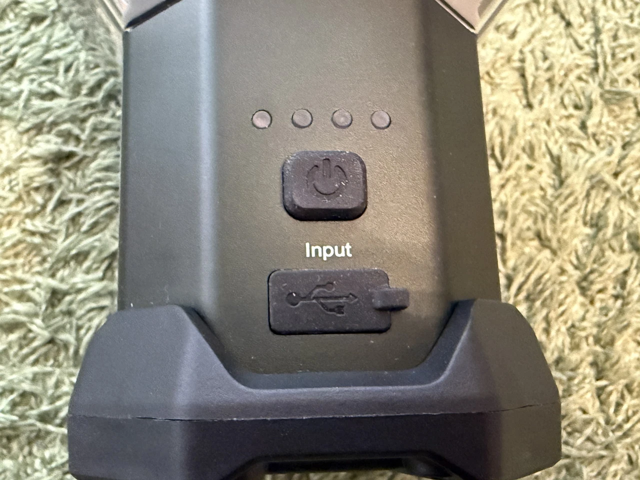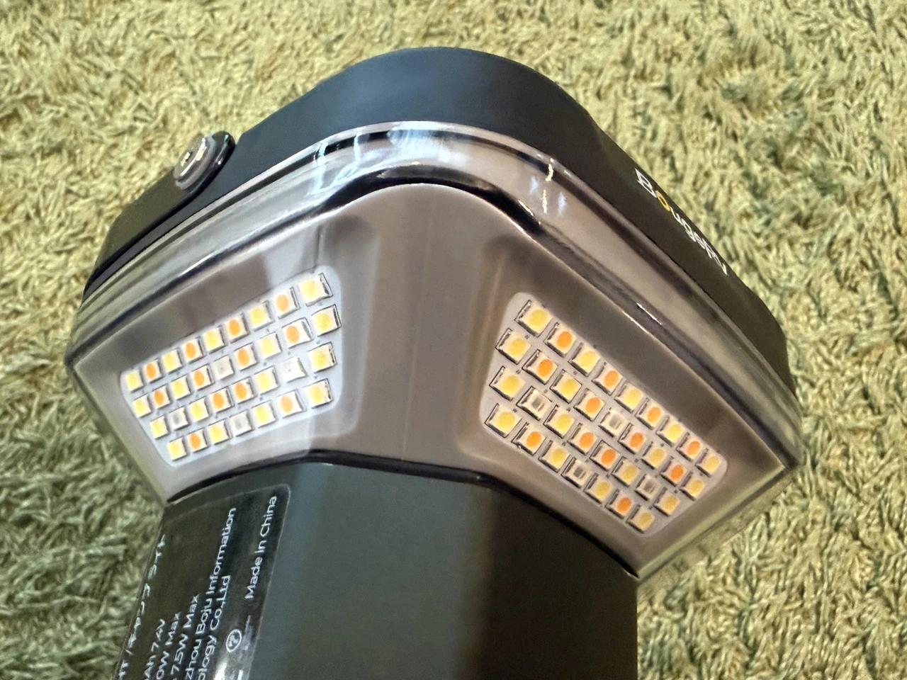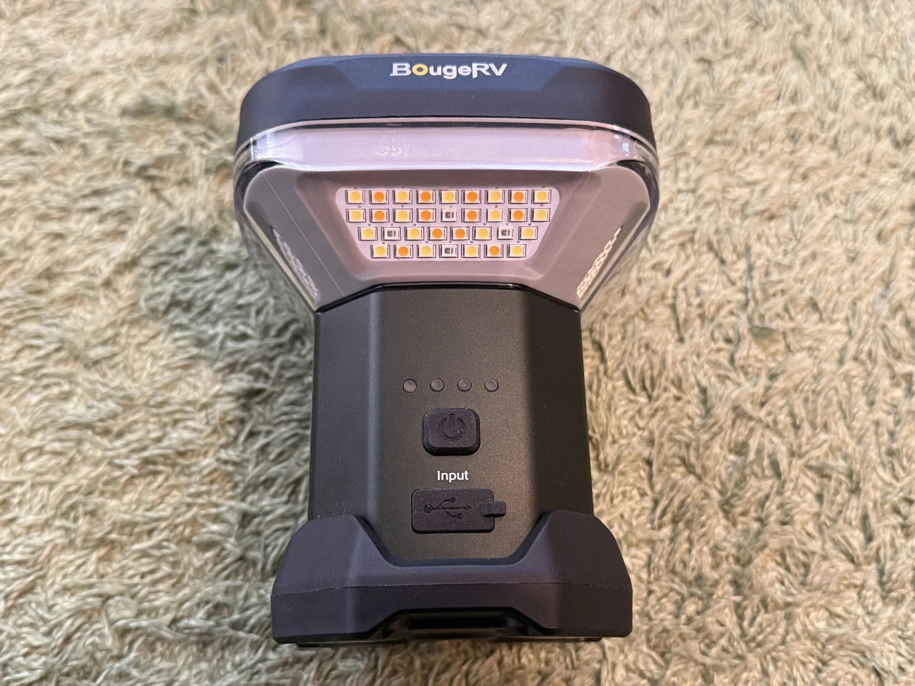 キャンプライトの電源ボタンを短押しすると、4面のLEDライトが点灯します。