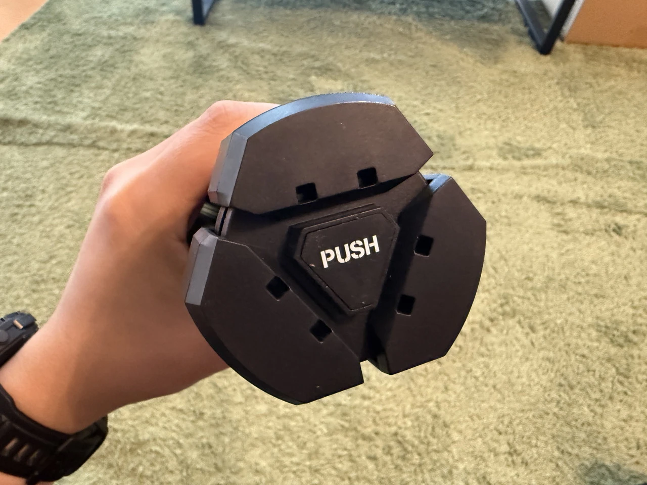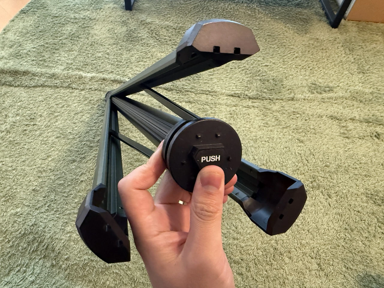 底部の "PUSH" と書かれた部分を押すと、三脚が展開します。普段は脚がロックされているので、持ち運び時に勝手に開いてしまうことはありません。