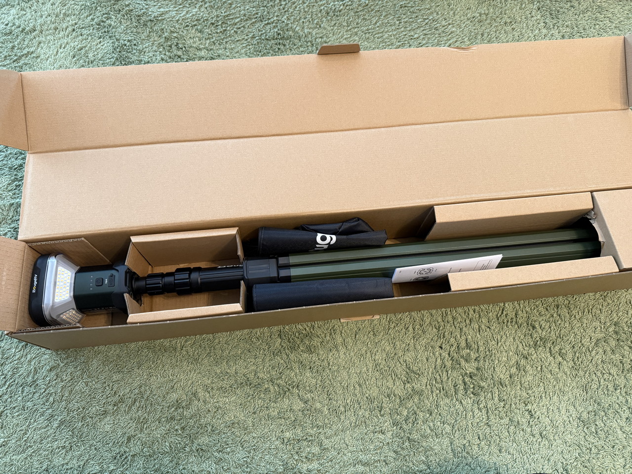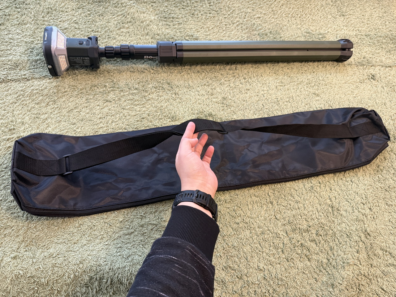 専用の収納バッグが付属しており、キャンプライトと三脚を収納し、肩掛けで持ち運べます。