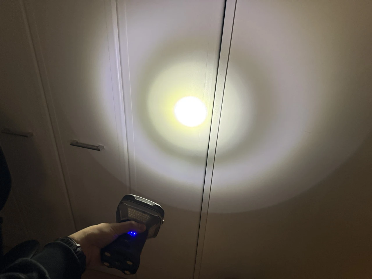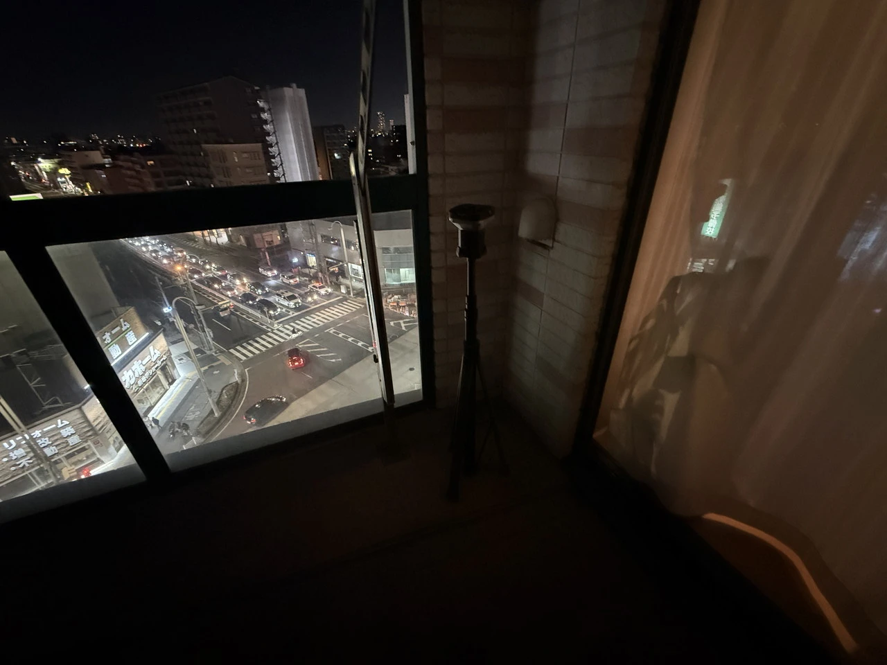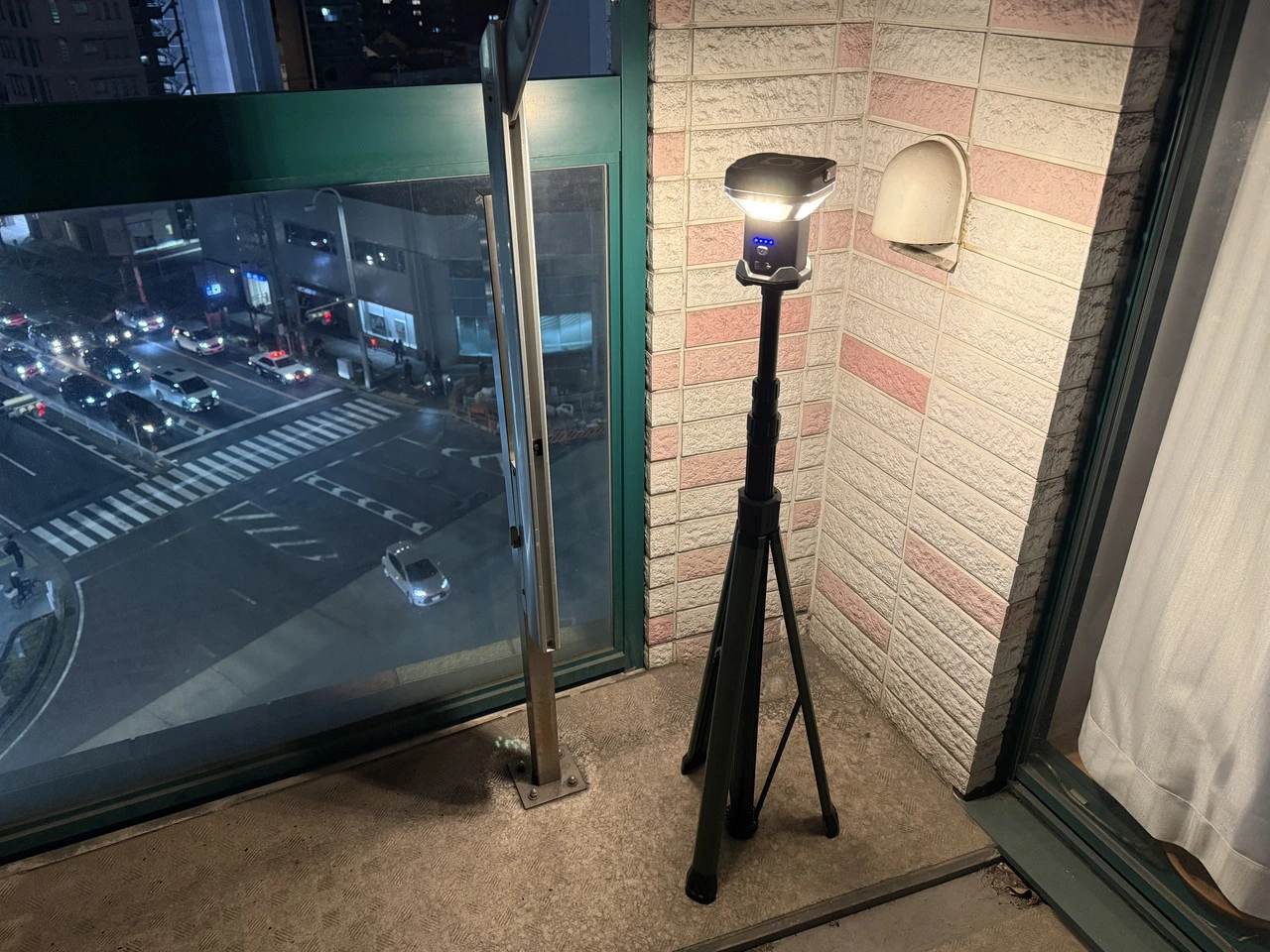 実際に夜間、照明のない10㎡ほどのベランダに三脚で設置し、最大光量で4面点灯させてみたところ、足元から周囲の壁面まで一気に照らし出されました。