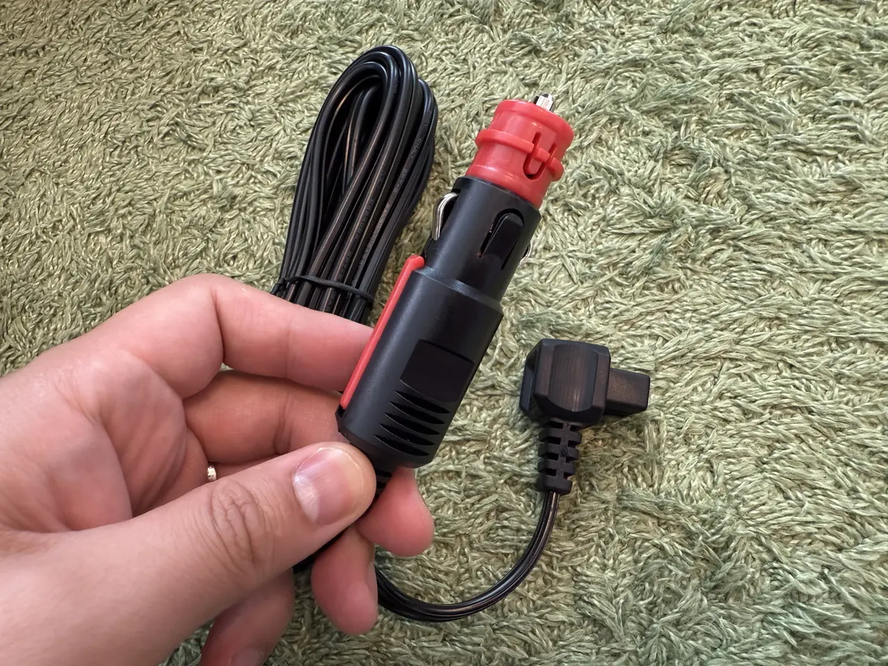 ▼12/24V DC電源コードが付属。車のシガーソケットからの給電も可能となっている。