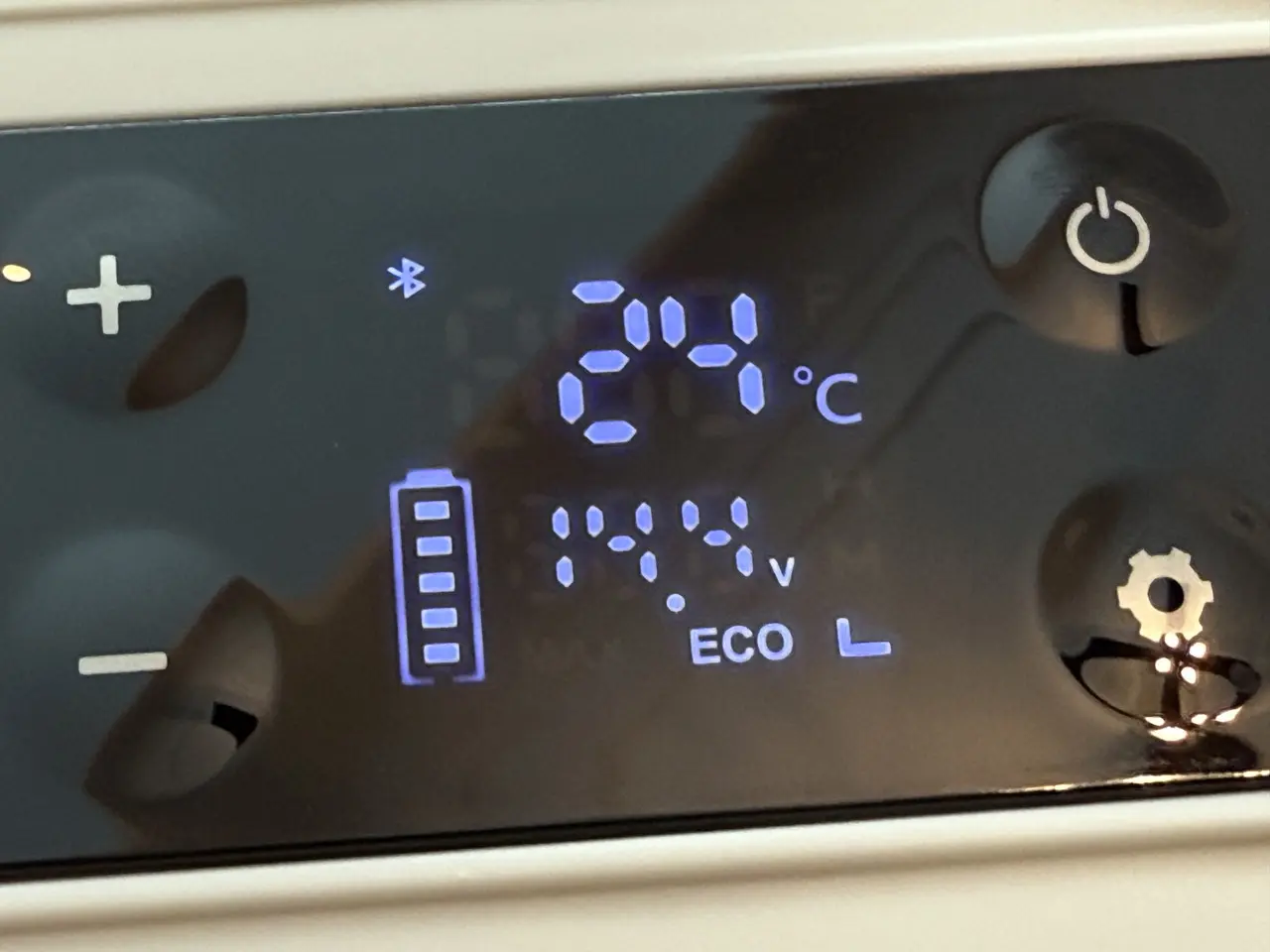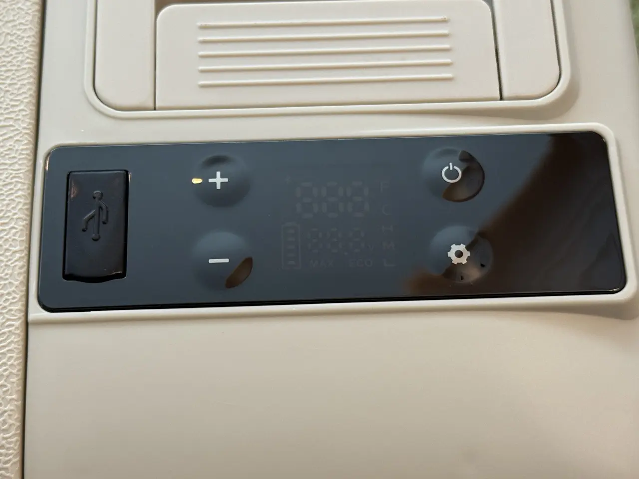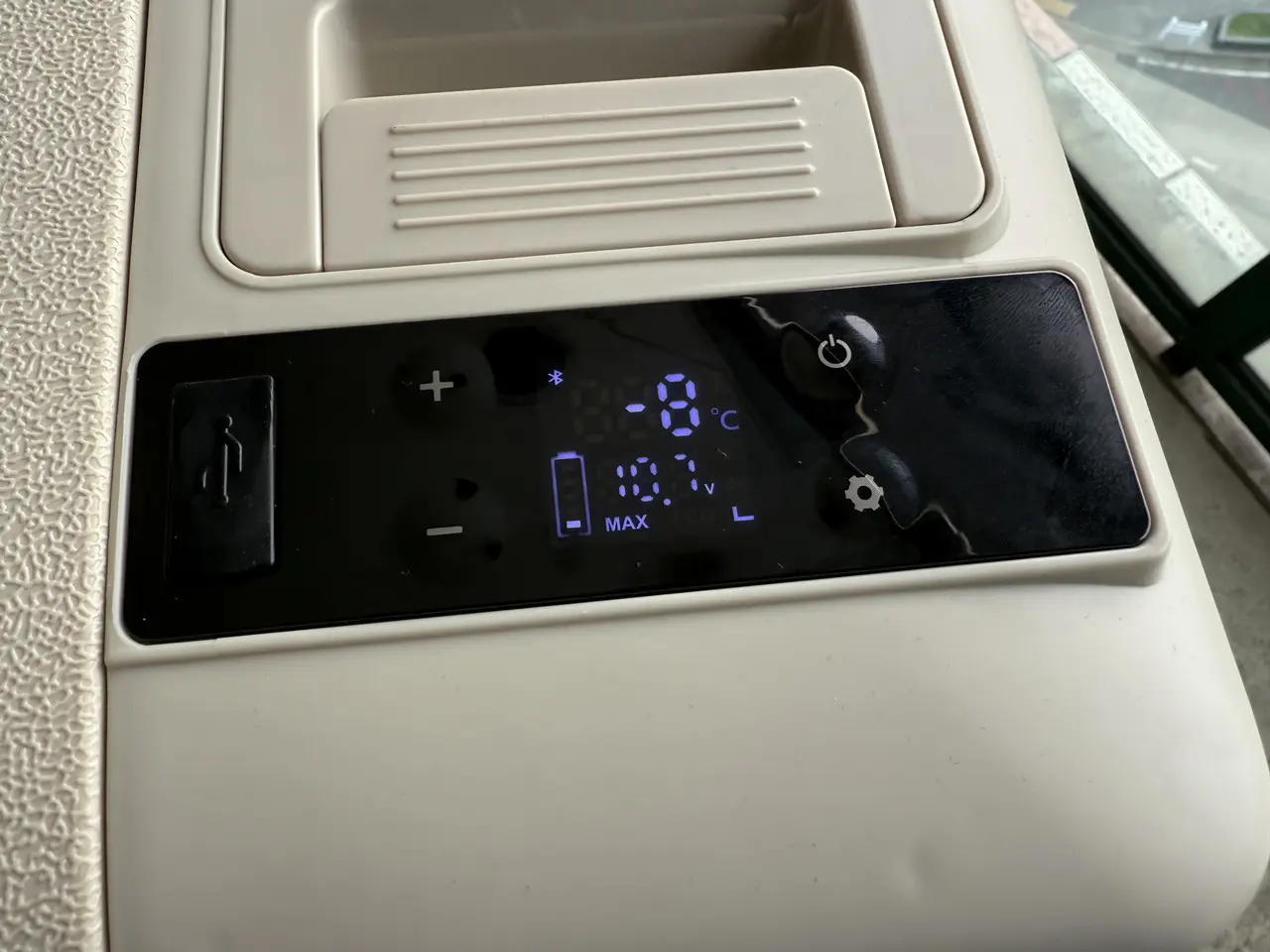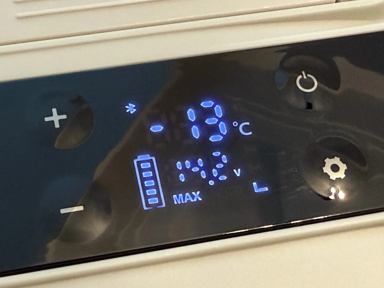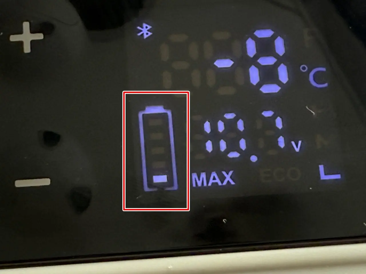 ▼ポータブル冷蔵庫上部のディスプレイより、バッテリー残量を確認できる。
