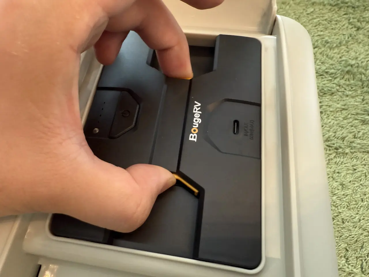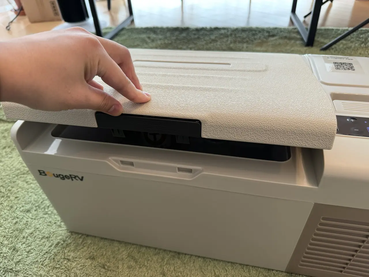 まず、充電済みのバッテリーをポータブル冷蔵庫上部に挿入する。