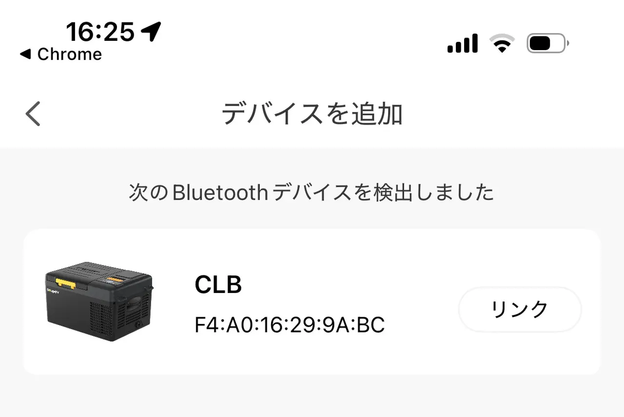 アプリインストール後、電源をオンにした状態のポータブル冷蔵庫とBluetooth接続を行う。