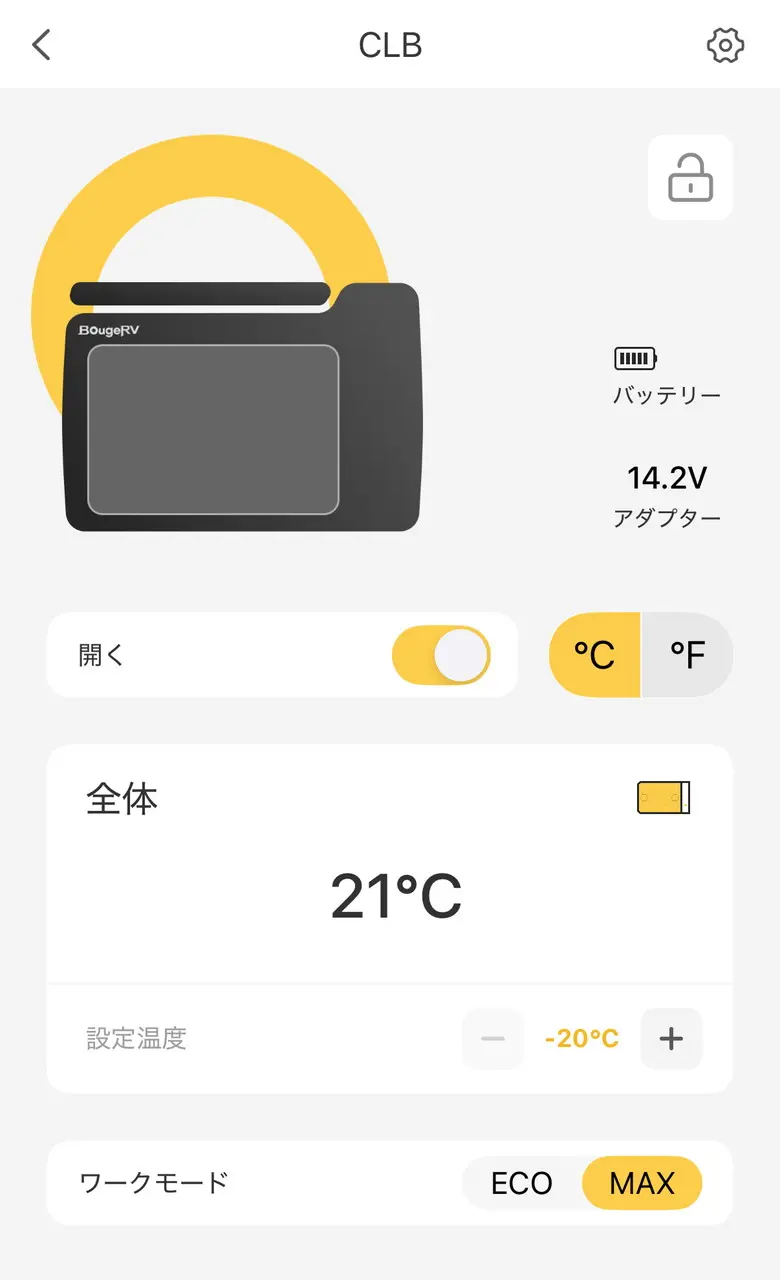 アプリ上ではポータブル冷蔵庫の状態をリアルタイムで把握できるほか、電源のオン/オフ切り替えも可能。また、モード切替やバッテリー保護機能の利用も可能だ。