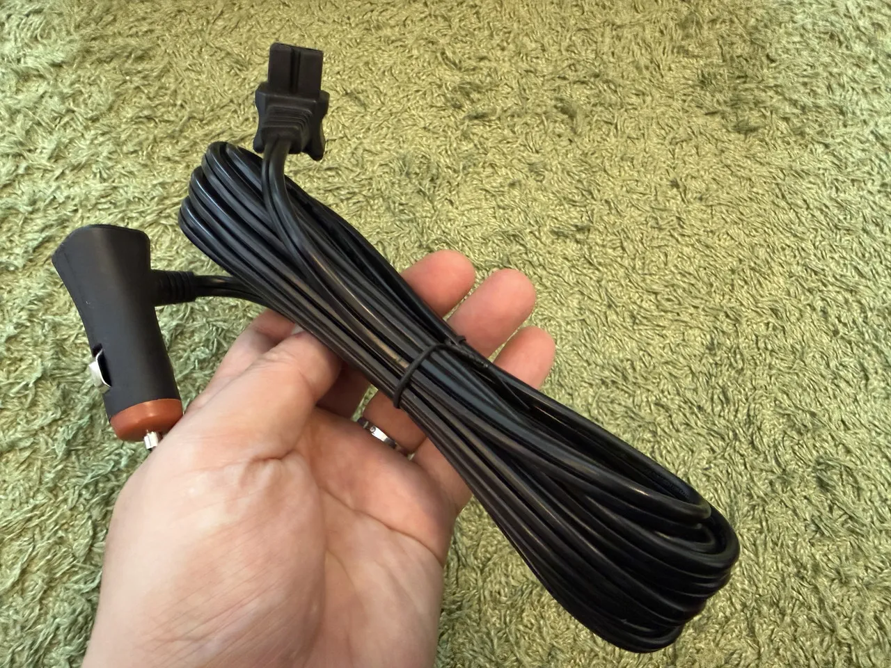 12/24Vシガーソケットケーブルを手に持っている