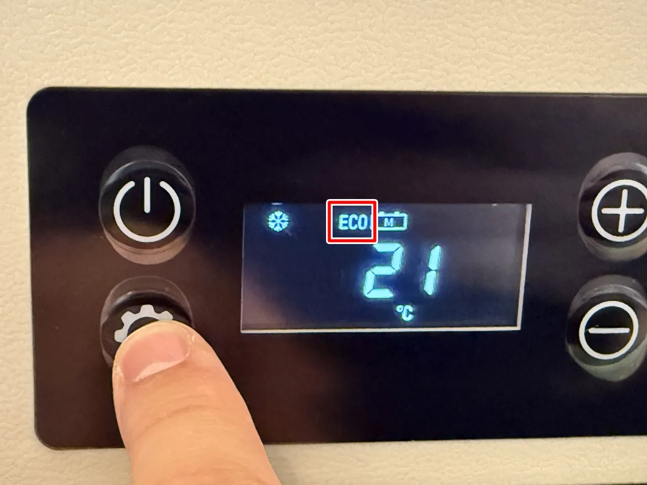 +(プラス)、-(マイナス)ボタンを押すことで、庫内温度を-20℃~20℃の範囲で調節可能。
