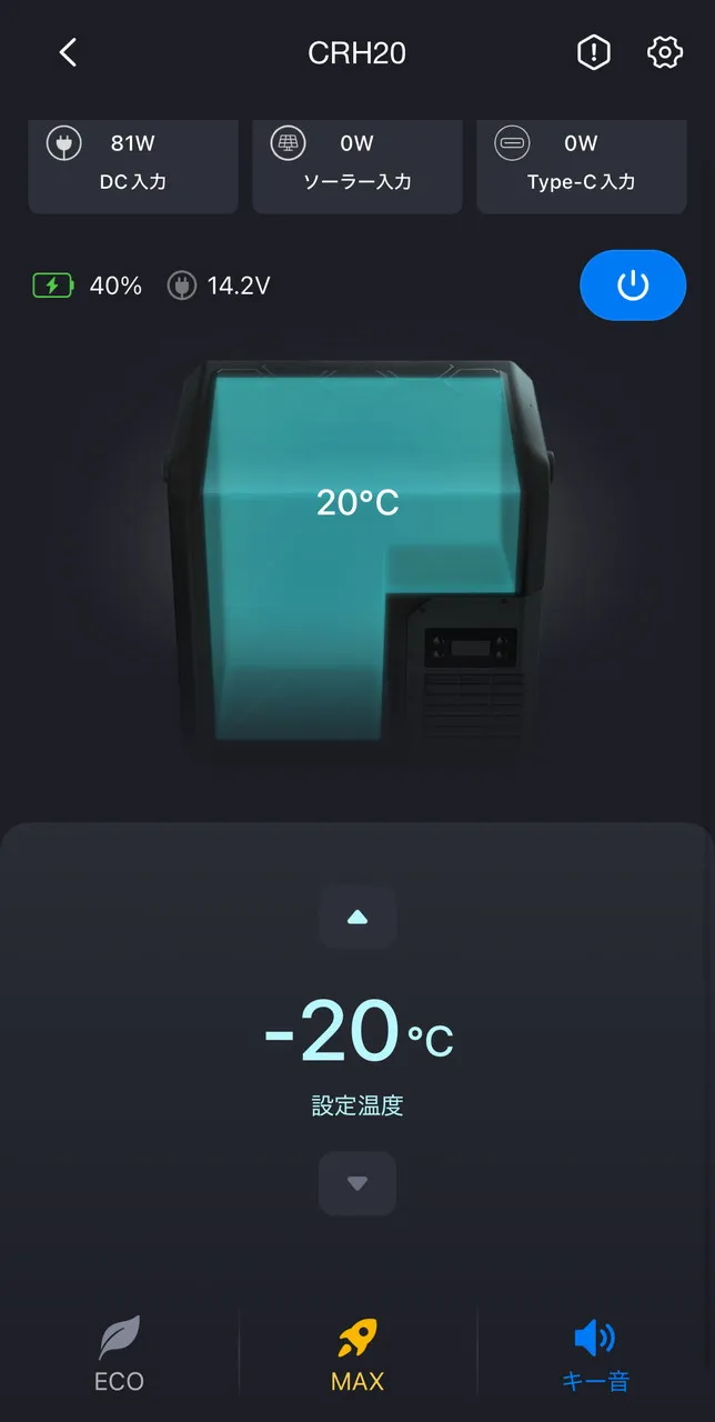 また、歯車アイコンボタンを押すと、運転モードを ECOモード(低出力・低消費電力) ⇔ MAXモード (高出力・高消費電力) の2種類で切り替えることができます。