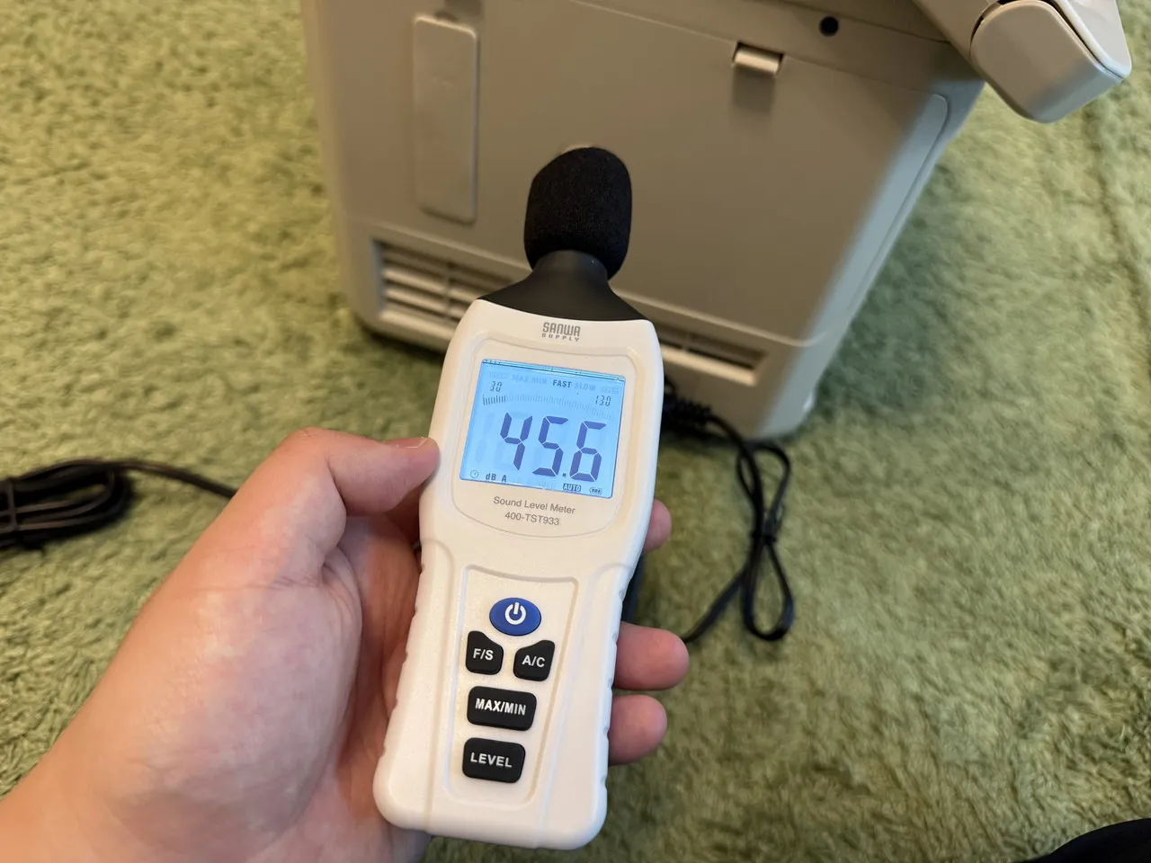 Aコンプレッサー式のため稼働音はありますが、実測では本体から約30cmの位置で45~46dB程度に収まっていました。体感的にも極端にうるさい印象はなく、静音性は比較的良好です。