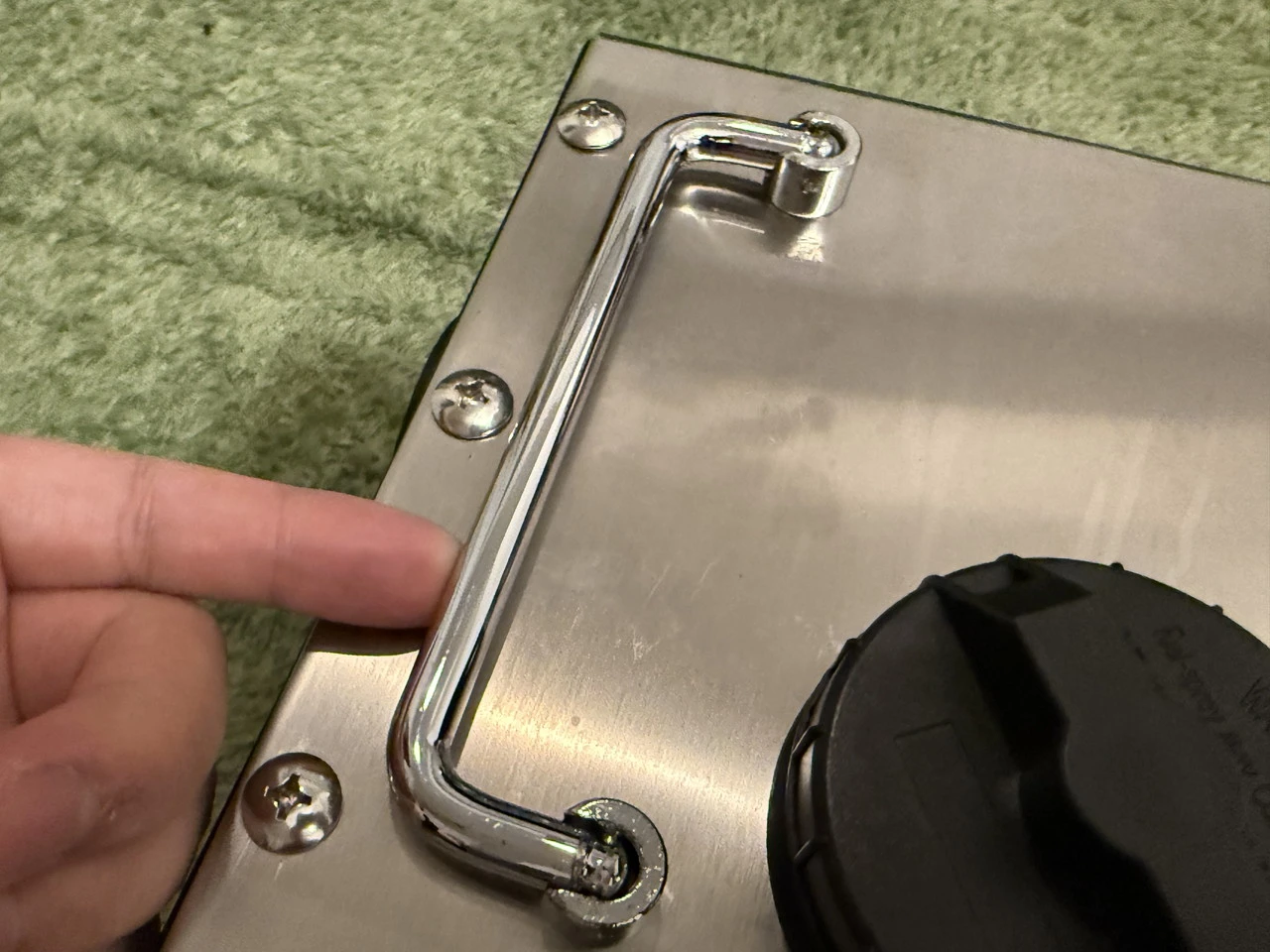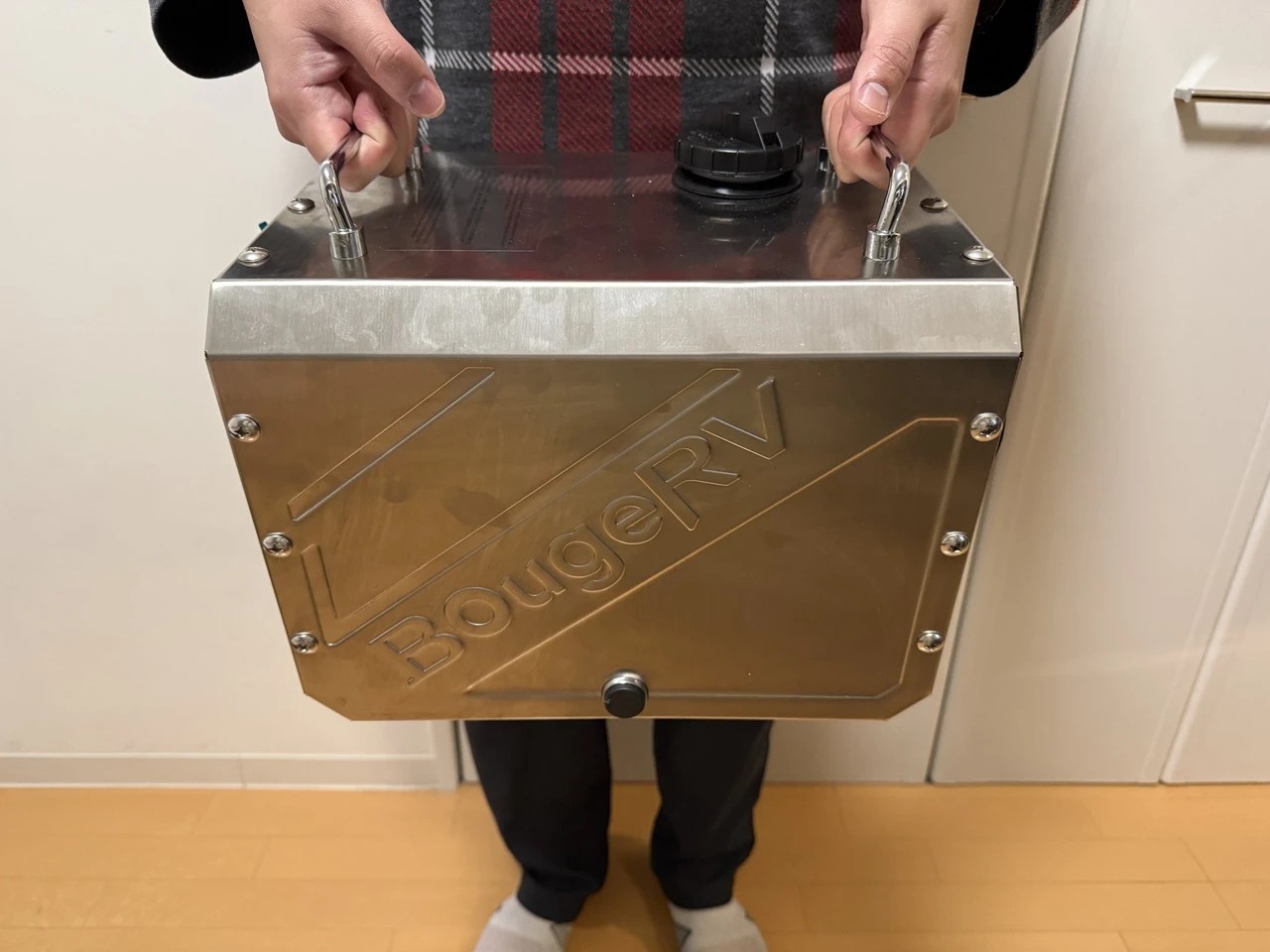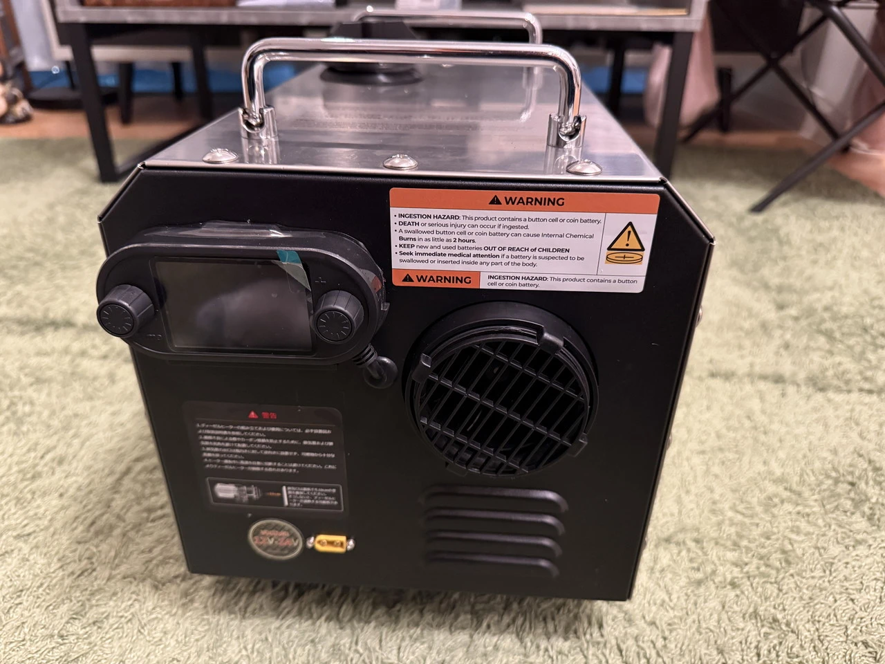 ヒーター本体はステンレス製の外装パネルで構成された、アウトドアデバイスらしい無骨な外観です。ギラギラと銀色の輝きを見せ、安定感と剛性感を感じさせます。