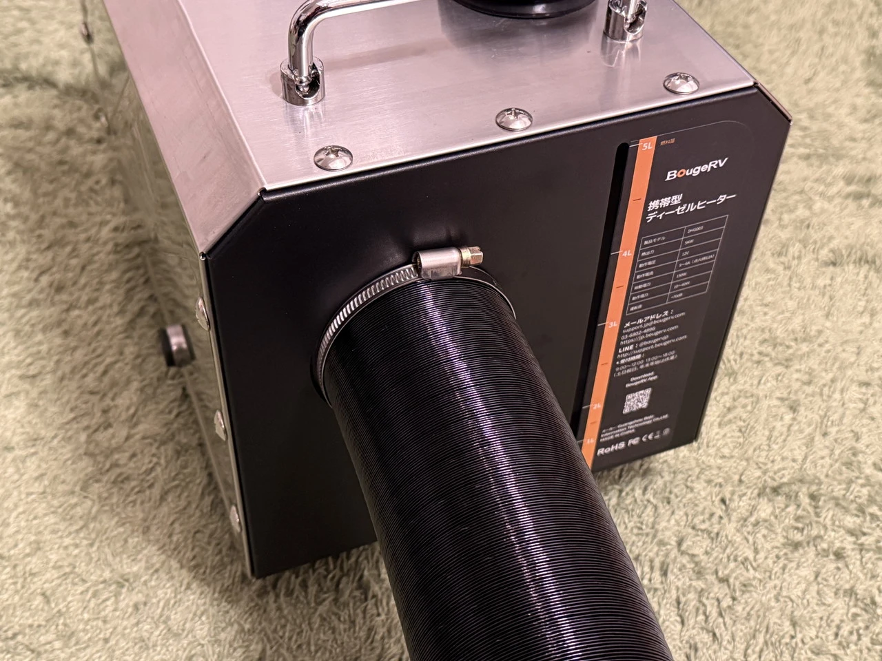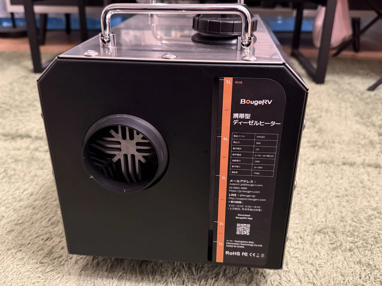 ポータブル冷蔵庫、ポータブル電源、ソーラーパネルなどを数多く手掛けるメーカーのBougeRVは、軽油専用のポータブルヒーター『BougeRV 一体型FFヒーター DHG003』を販売していました。