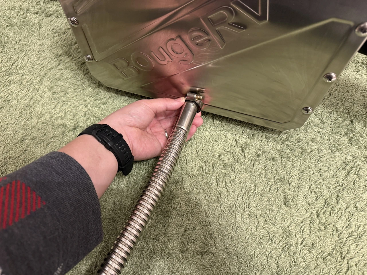 付属の排気管を本体に取り付け、ホースクランプでしっかり固定します。
