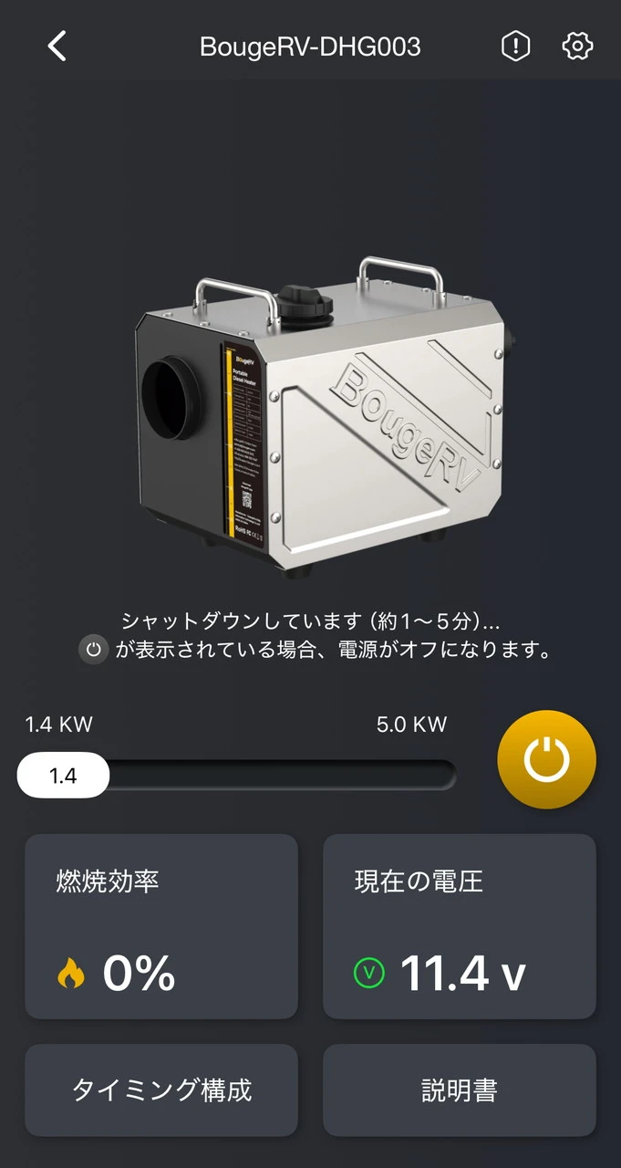 出力は1.4~5.0kWの範囲で0.1kW単位の細かな調整が可能。12V/24V電源に対応し、3~4人用テントであれば約10分ほどで体感温度の上昇を実感できるでしょう。