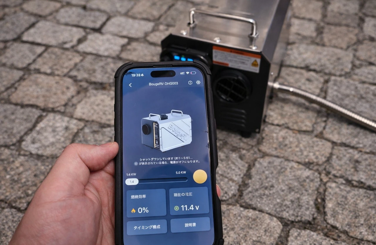 一体型設計のため車両加工が不要で、設置の自由度が高いのも魅力です。ポータブル電源やシガーソケットで動かせるため、「FFヒーターに興味はあるけど導入ハードルが高そう」と感じていた人でも、比較的手を出しやすいモデルだと思います。アプリ連携による遠隔操作やタイマー機能も便利でした。