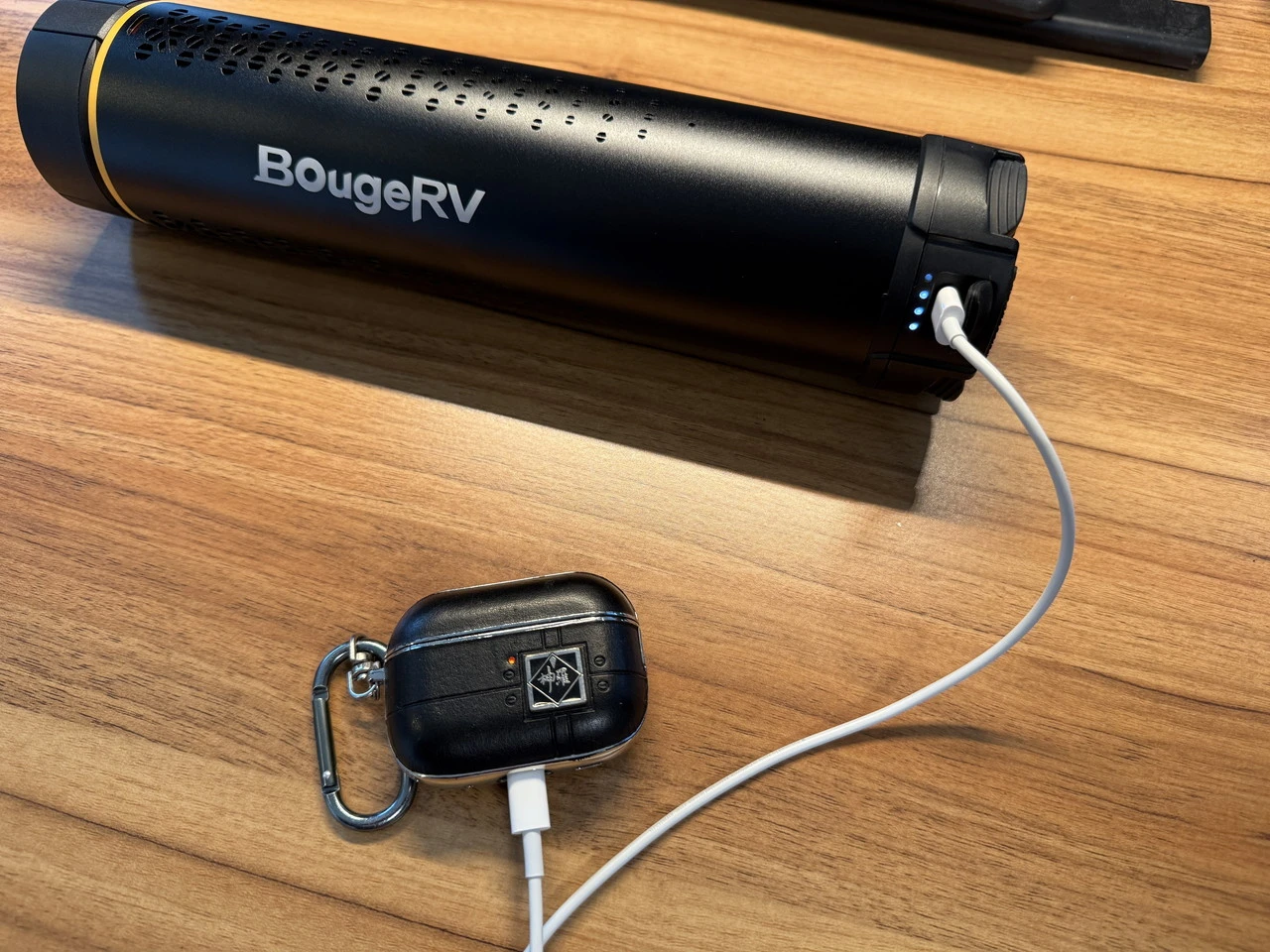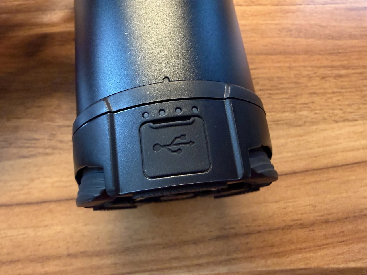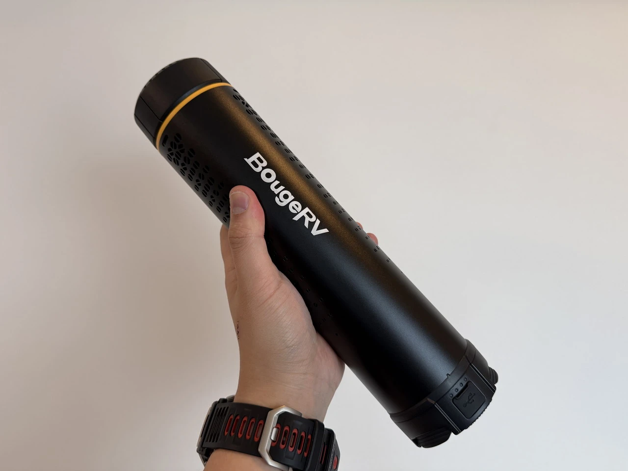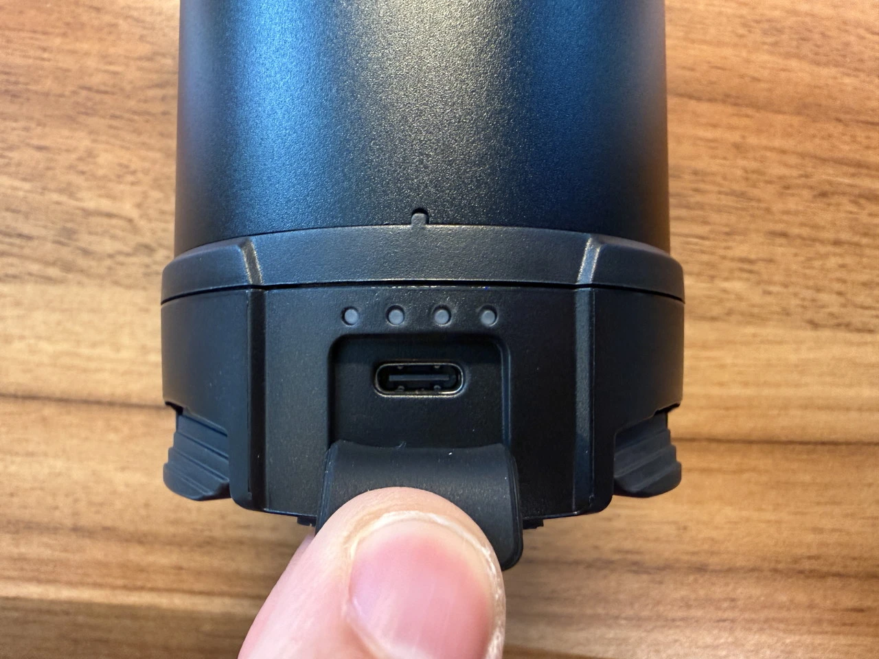 そして下部側面には充電残量を示すインジケータと、USB-Cポートが用意。ポートはゴムキャップで保護されており水気や塵の侵入を防ぎます。
