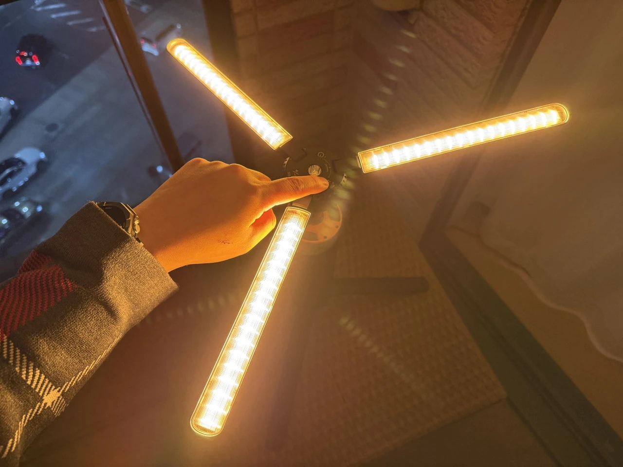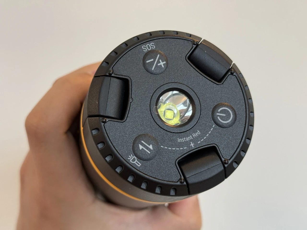上部には中央に懐中電灯が備わっているほか、取り囲むように電源ボタン、色温度/モード切替ボタン、SOSモード/明るさ切替ボタンが用意。また、3本のライトパネルも収納されています。