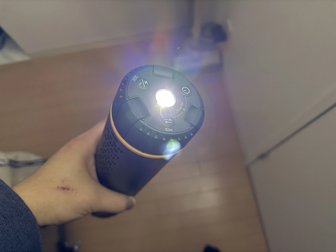 点灯中にモード切替ボタンを長押しすると、上部中央のLEDが点灯して懐中電灯のような使い方ができるようになります。