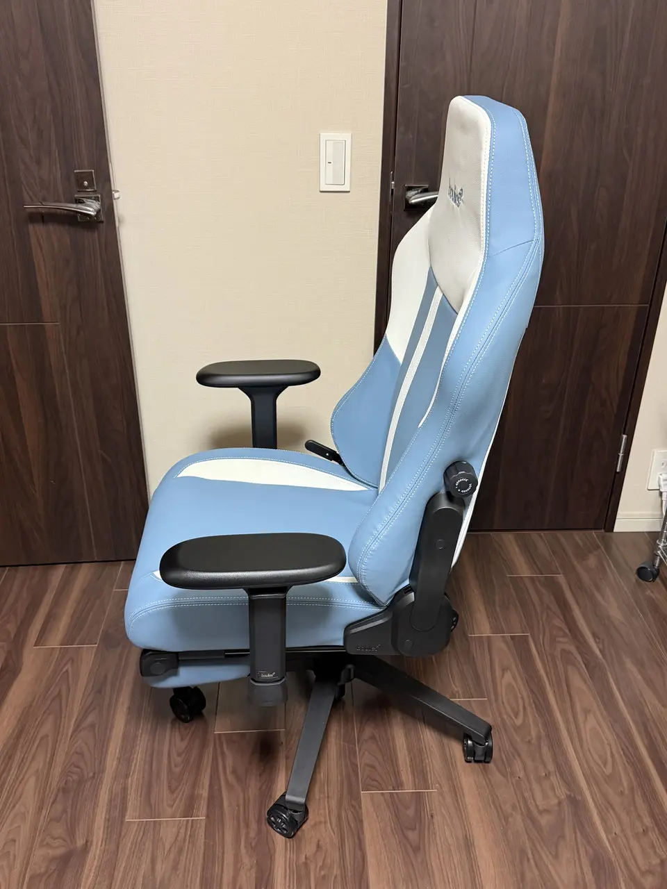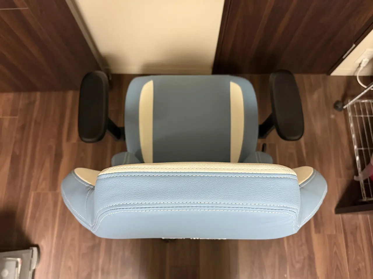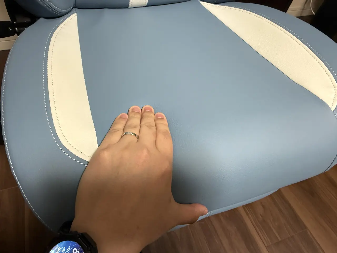表面素材にはPUレザーを採用。マット寄りで安っぽさはなく、光の当たり方によっては高級チェアらしい質感も感じられます。ステッチ処理も比較的丁寧で、価格帯を考えると仕上がりは良好です。
