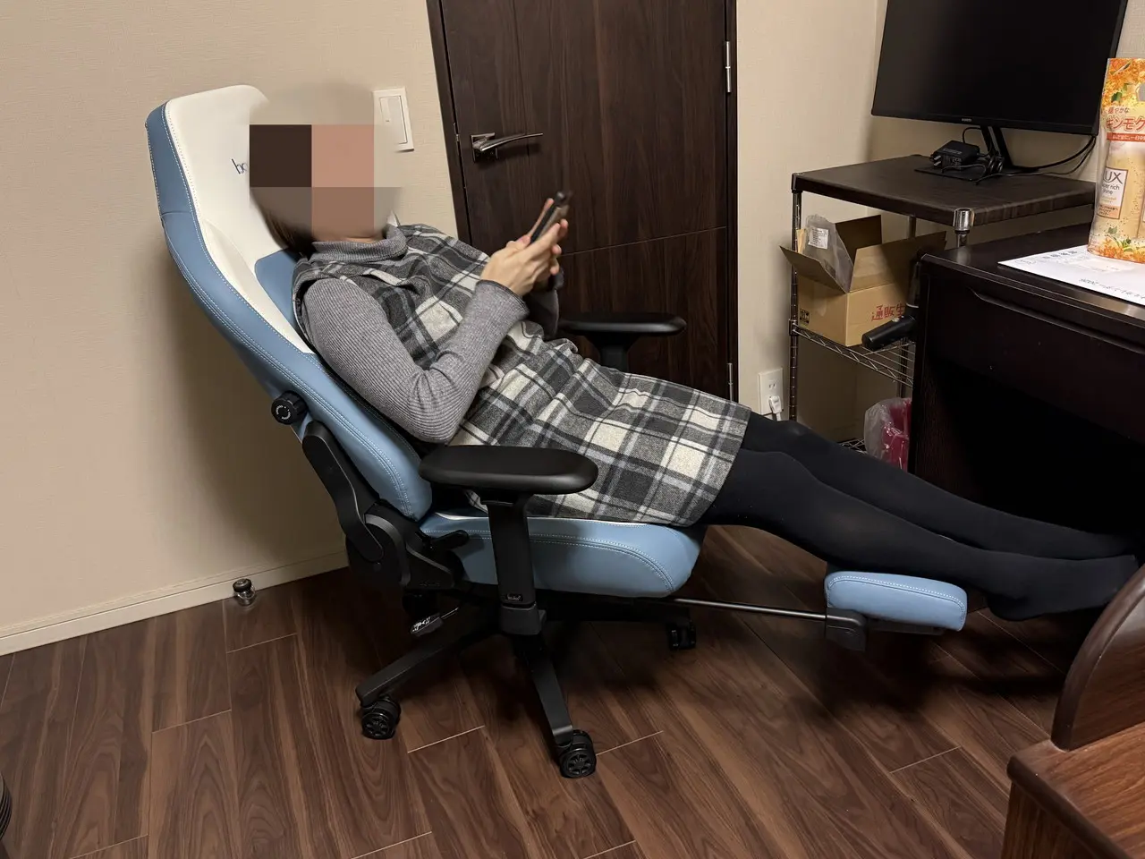 そして座面下から引き出す収納式オットマンは、脚を前に伸ばした際にふくらはぎを支えてくれるため、リクライニングと組み合わせることで体重が分散され、腰への負担が軽減されます。作業の合間に姿勢を崩してちょっと休憩したい場面などでは特に重宝します。