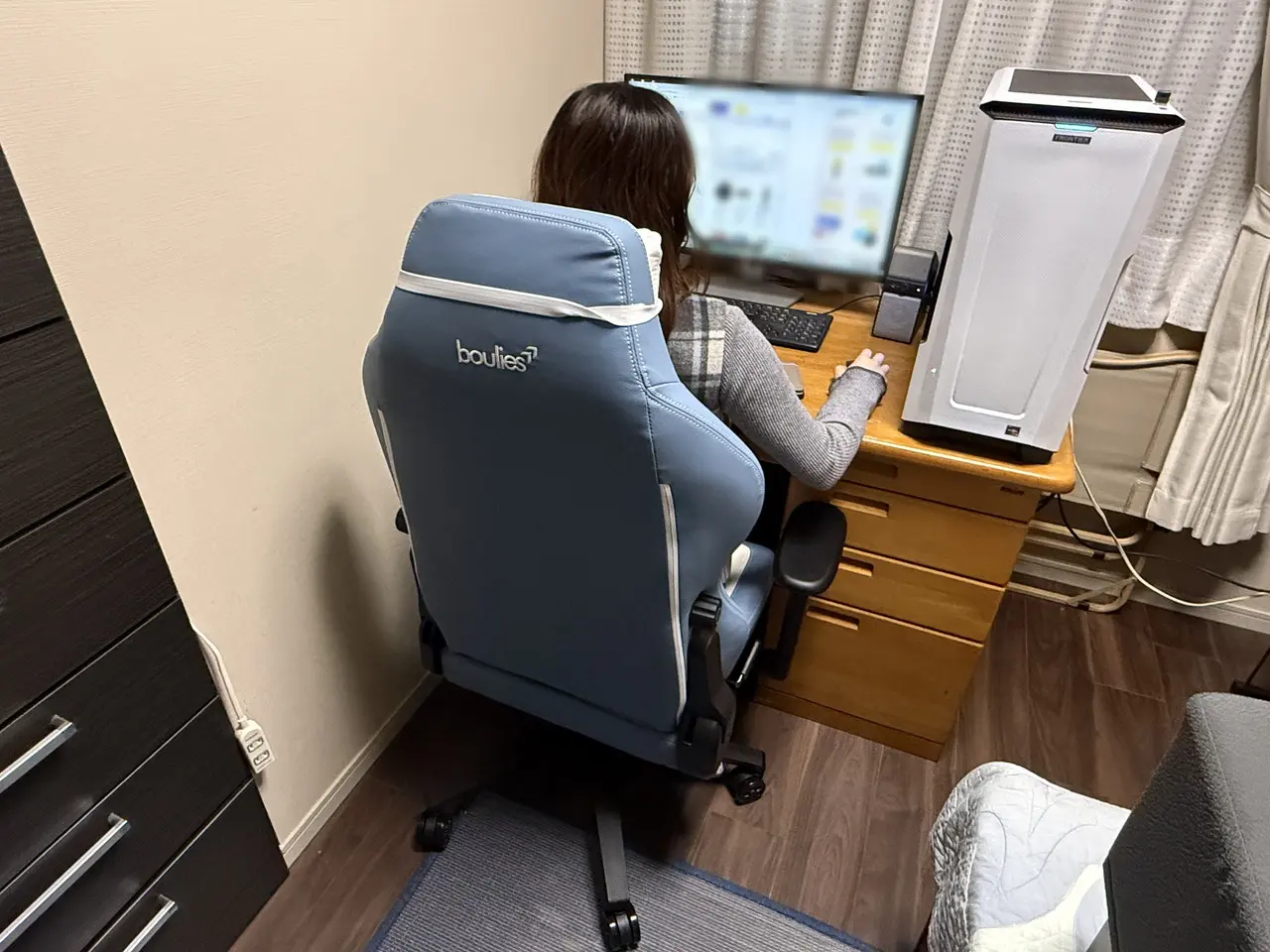 今回のレビューではブルー色を使用していますが、発色が強すぎず、やや落ち着いた "くすみ系" のトーン仕上げで、在宅ワーク用のデスク環境でも浮きにくい色合いとなっています。