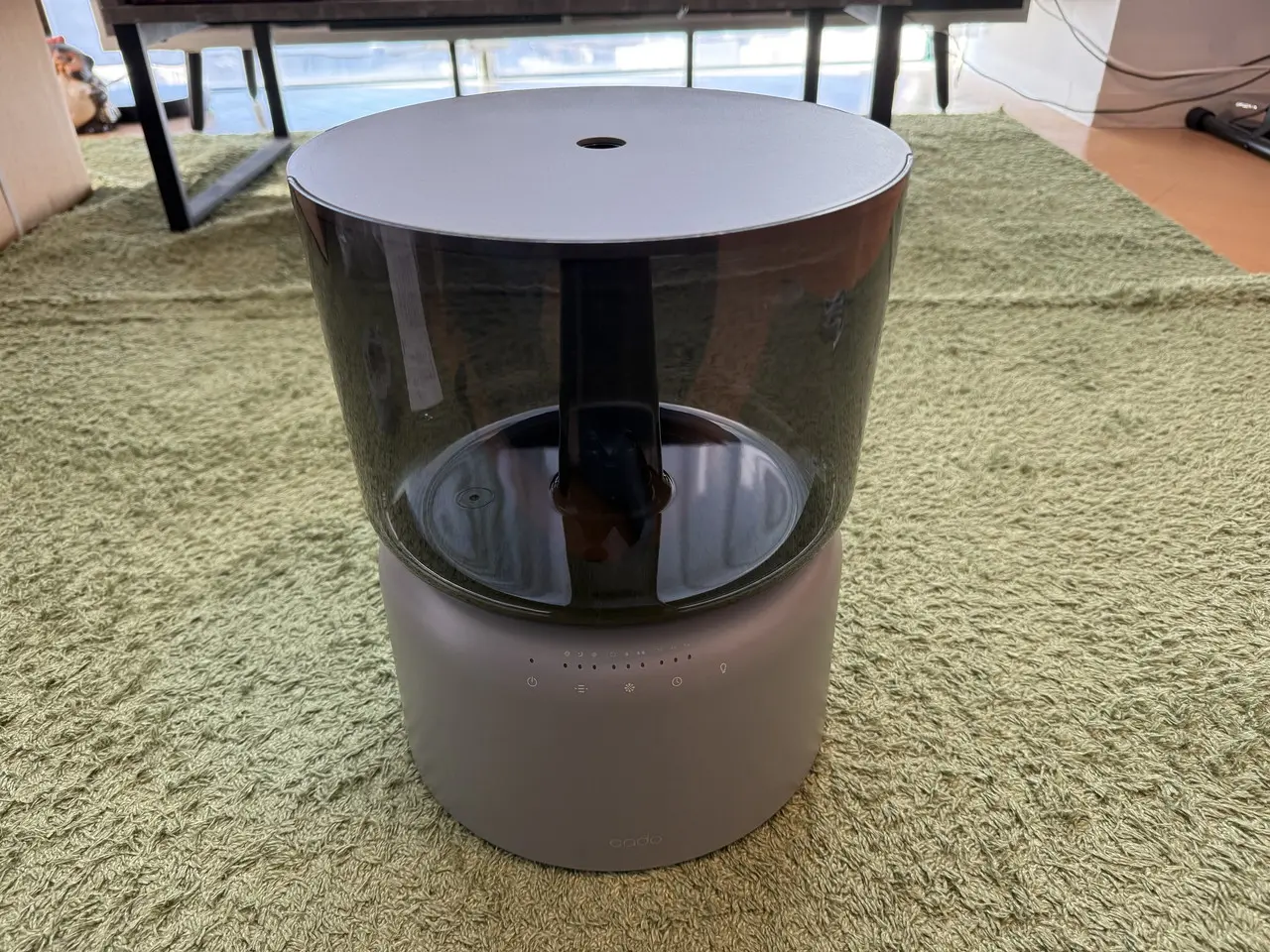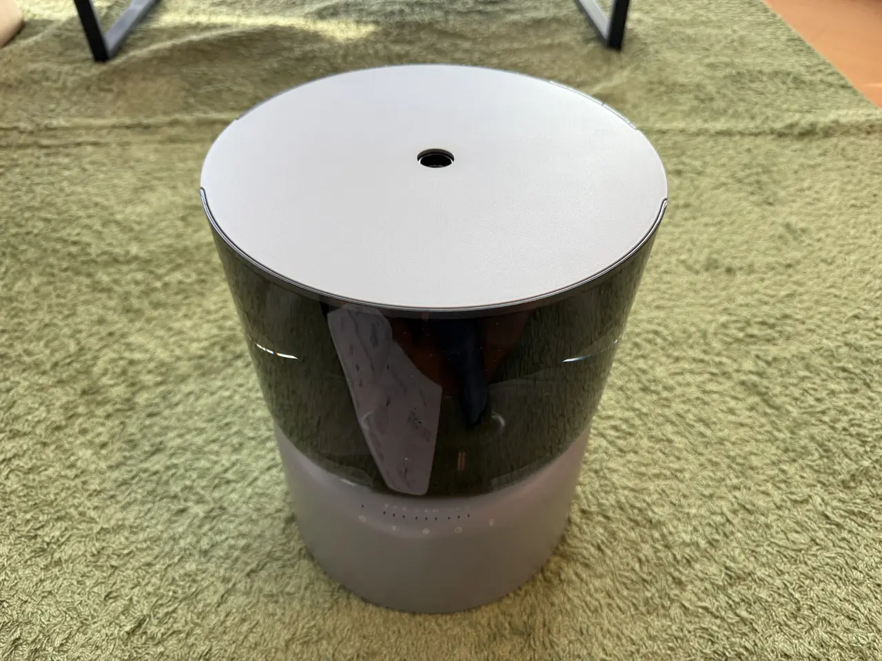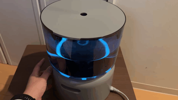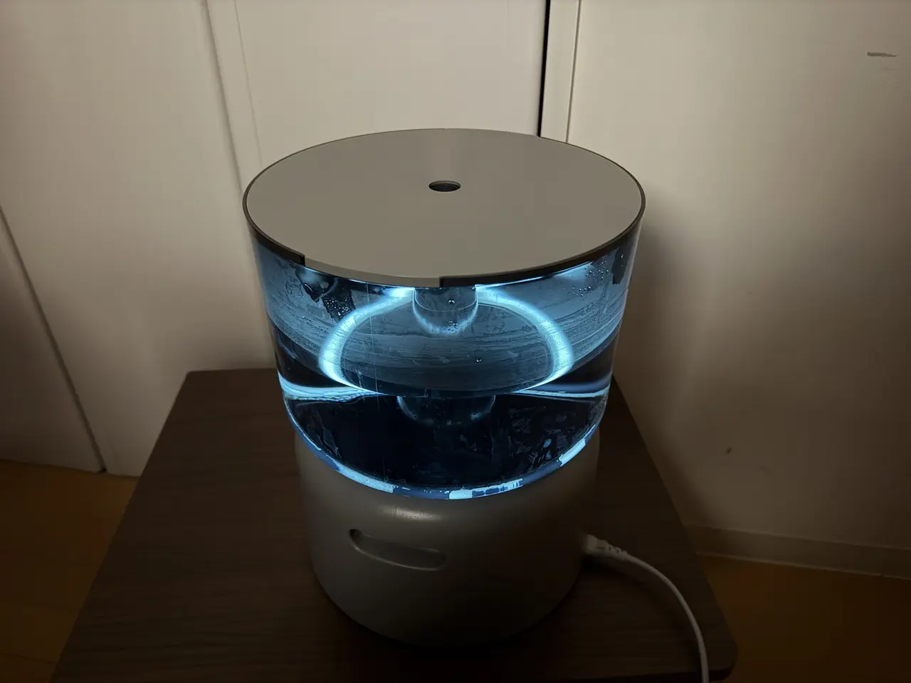 水の中をほのかに照らすやわらかな光が広がり、暗めの室内ではまるでモダンな照明器具のように機能します。加湿器としての実用性だけでなく、空間に溶け込む上質なインテリア性を感じることができました。
