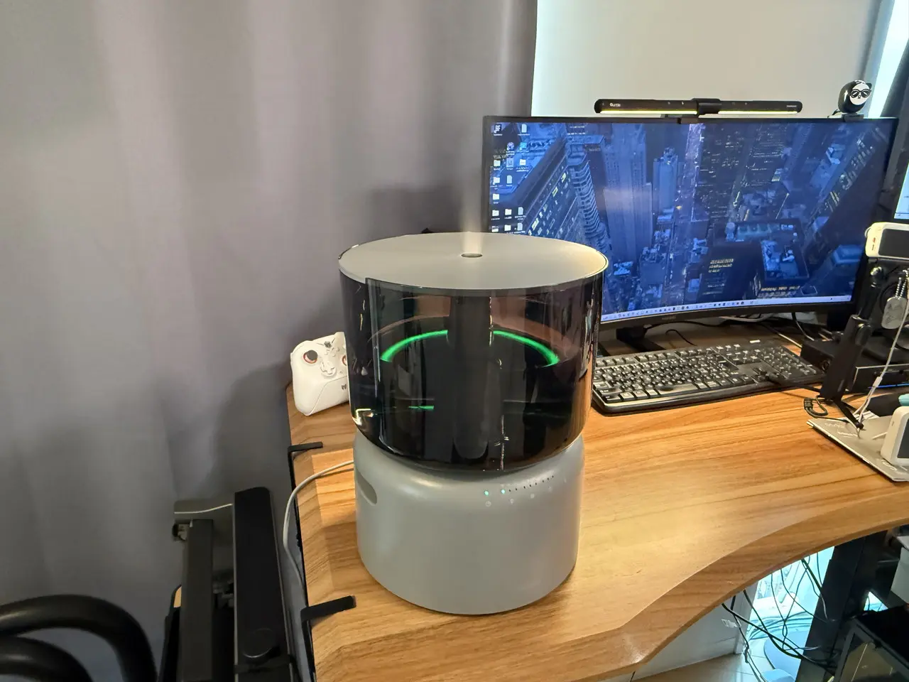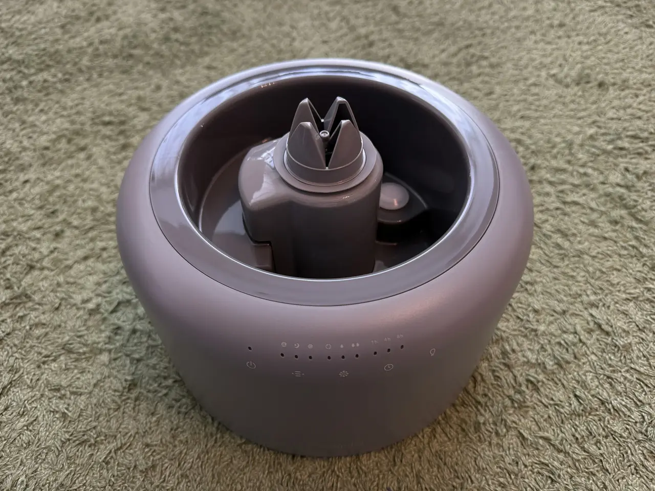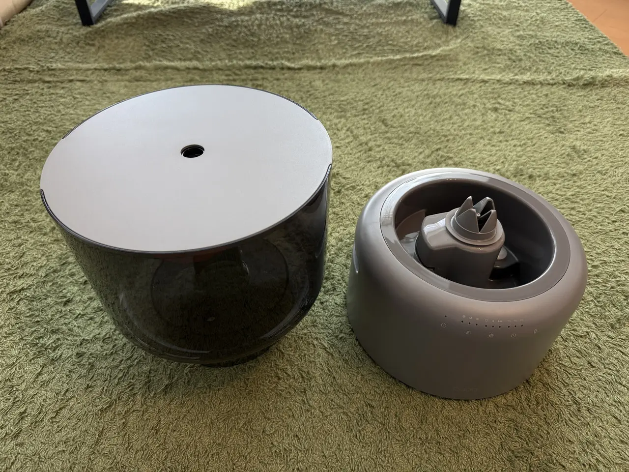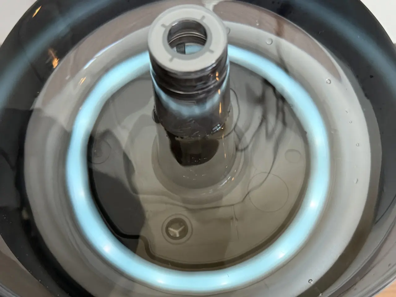 水の中をほのかに照らすやわらかな光が広がり、暗めの室内ではまるでモダンな照明器具のように機能します。加湿器としての実用性だけでなく、空間に溶け込む上質なインテリア性を感じることができました。